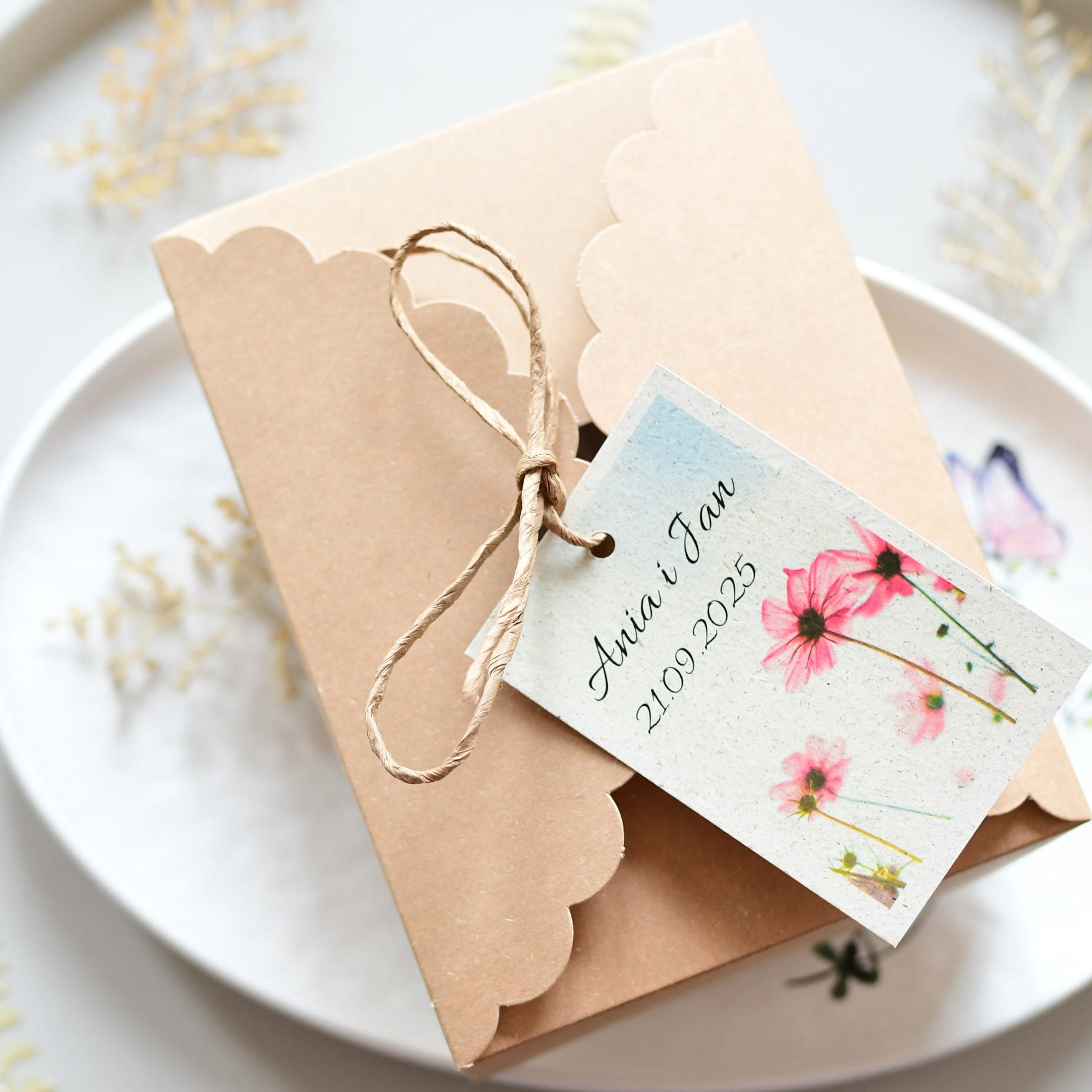 Modne opakowania na ciasto weselne w stylu boho.