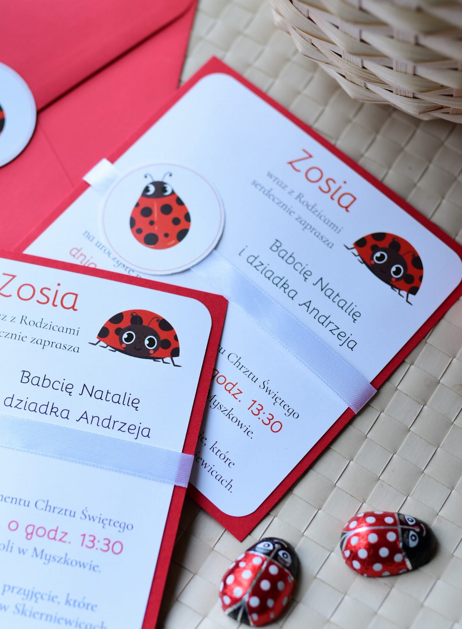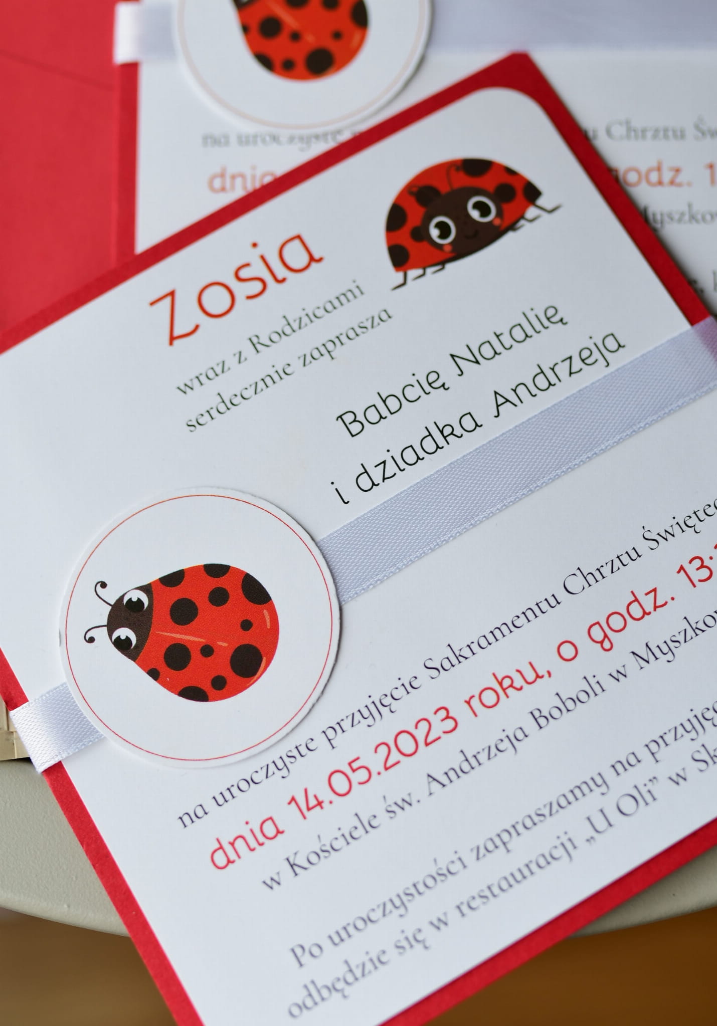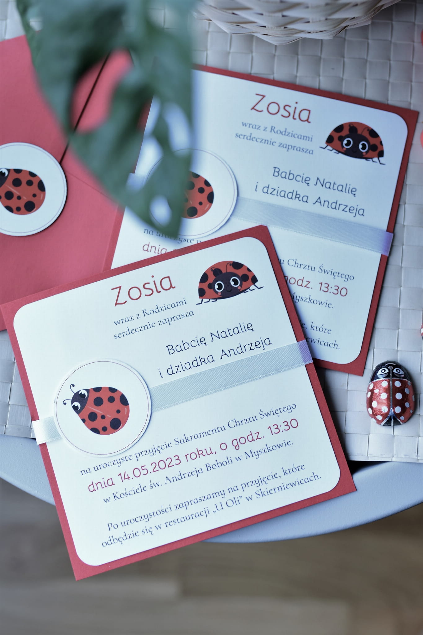 Nietypowe zaproszenia na chrzciny BIEDRONECZKI z wydrukiem listy gości.