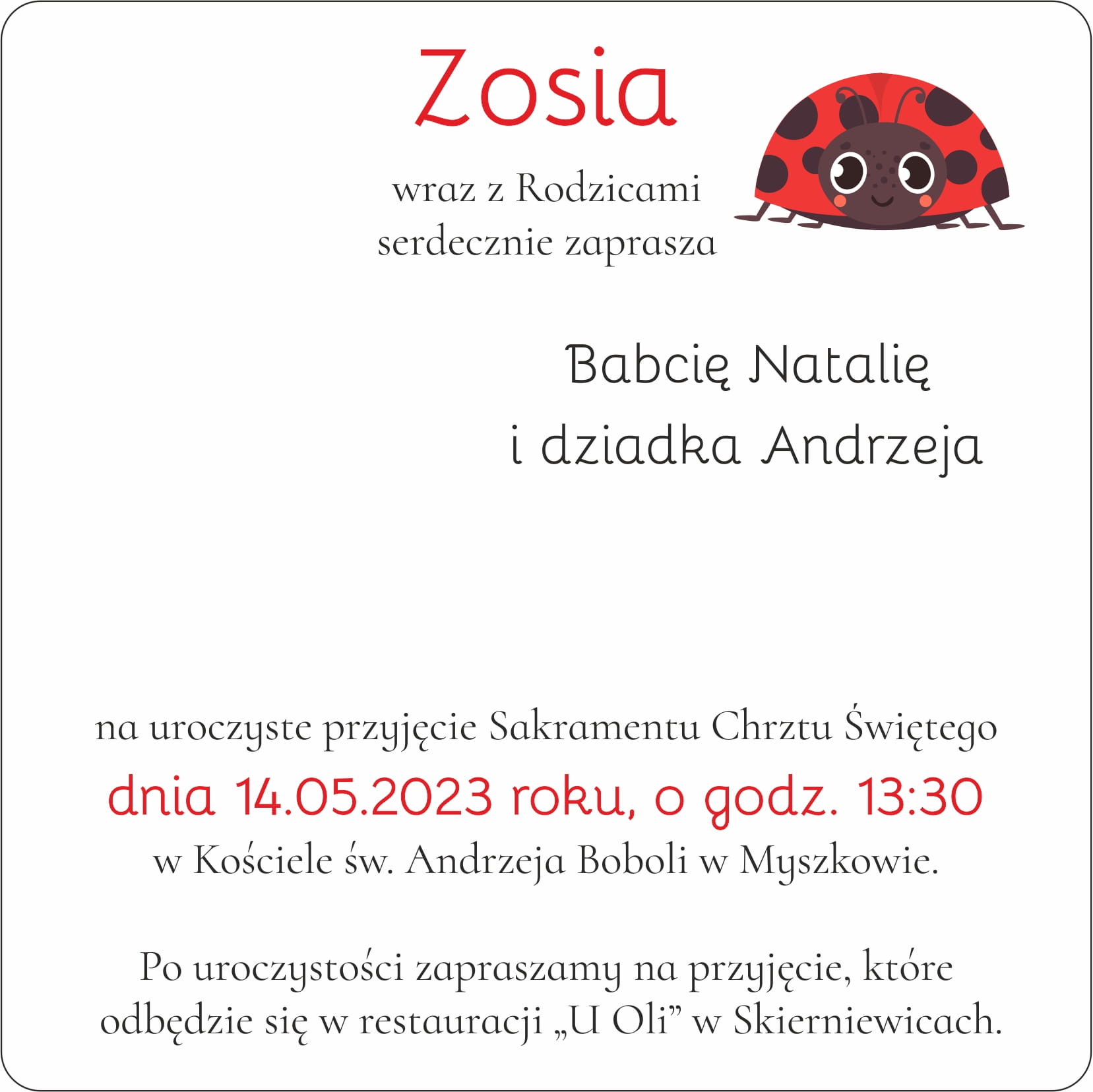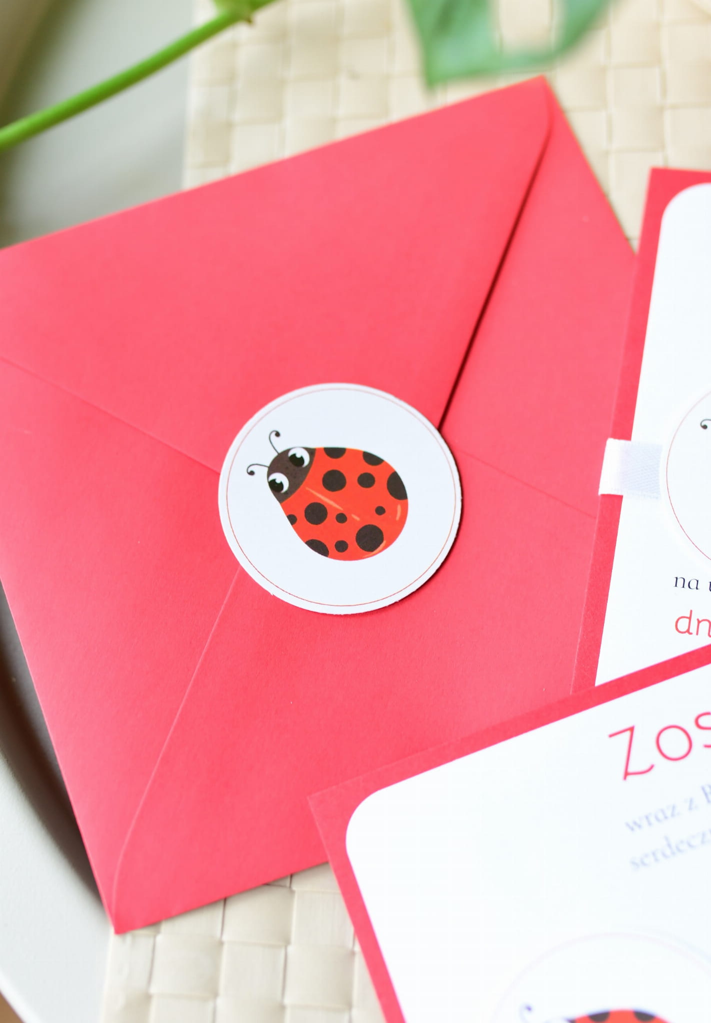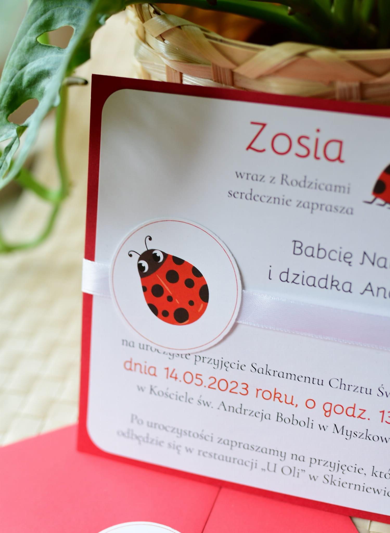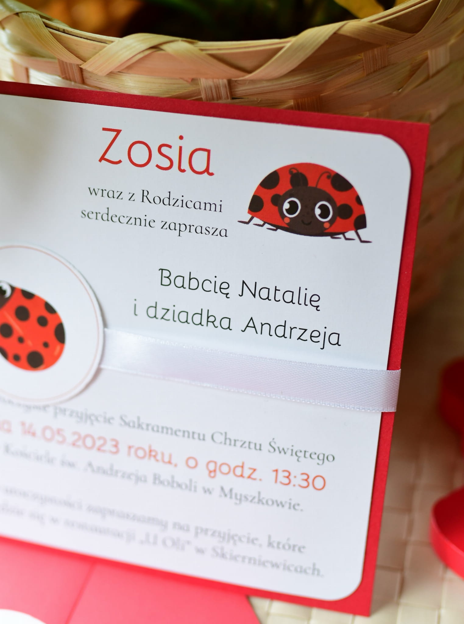 Nietypowe zaproszenia na chrzciny BIEDRONECZKI z wydrukiem listy gości.