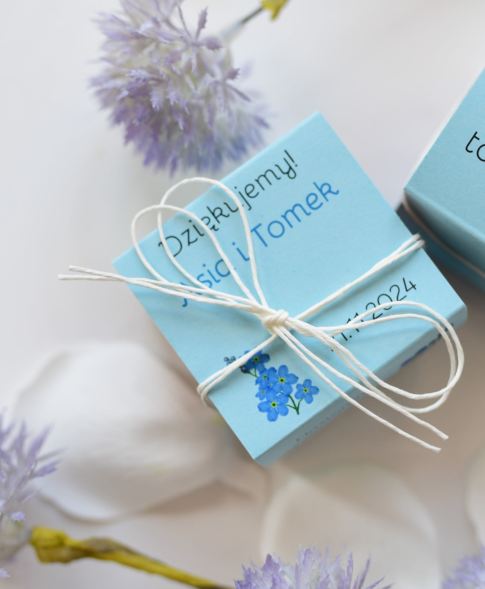 Upominki dla gości są gotowe do rozdania! Kokardka jest zawiązana na produkcie.