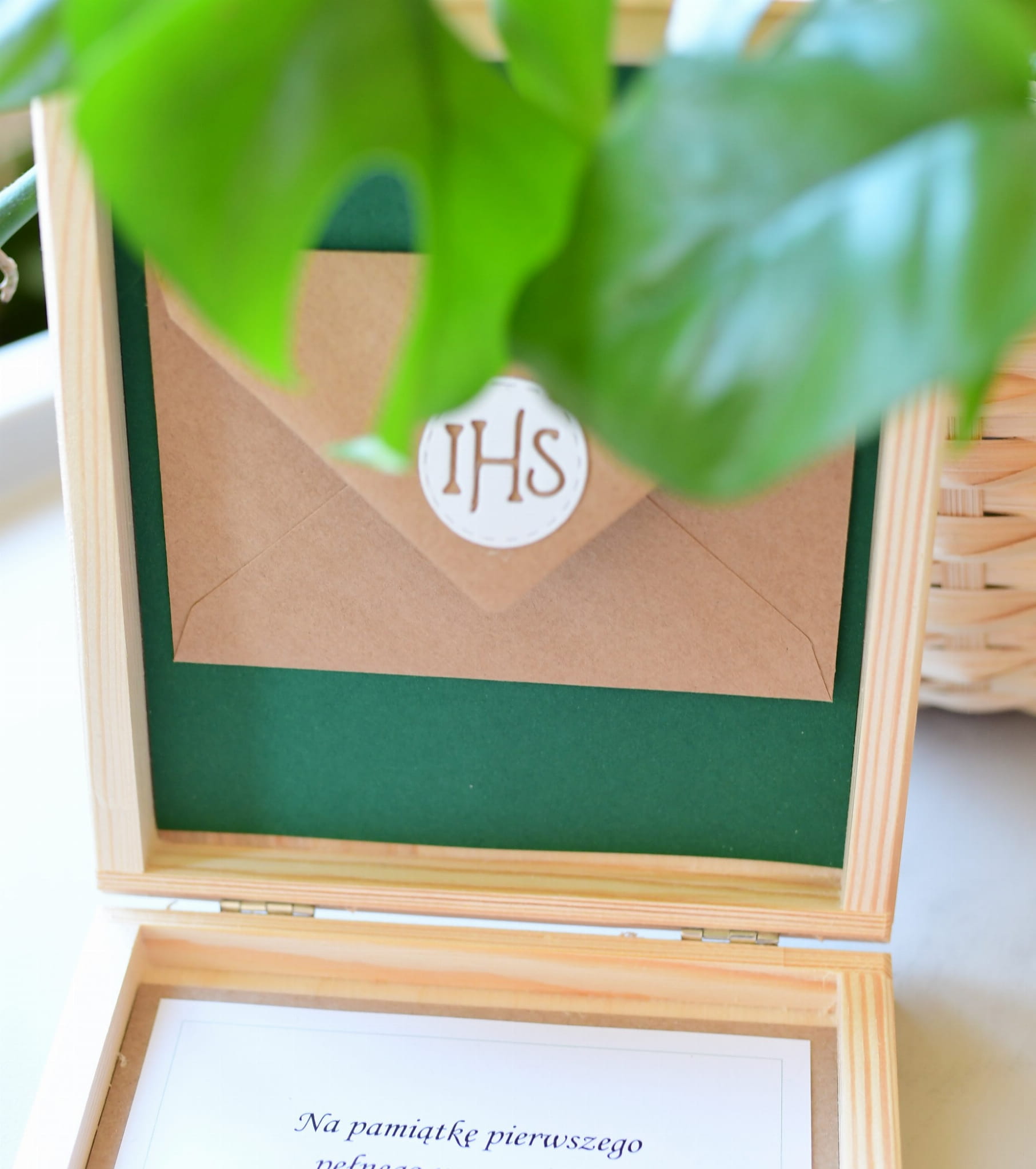 drewniana RUSTYKALNA skrzynka z życzeniami i kopertą z okazji I Komunii Świętej