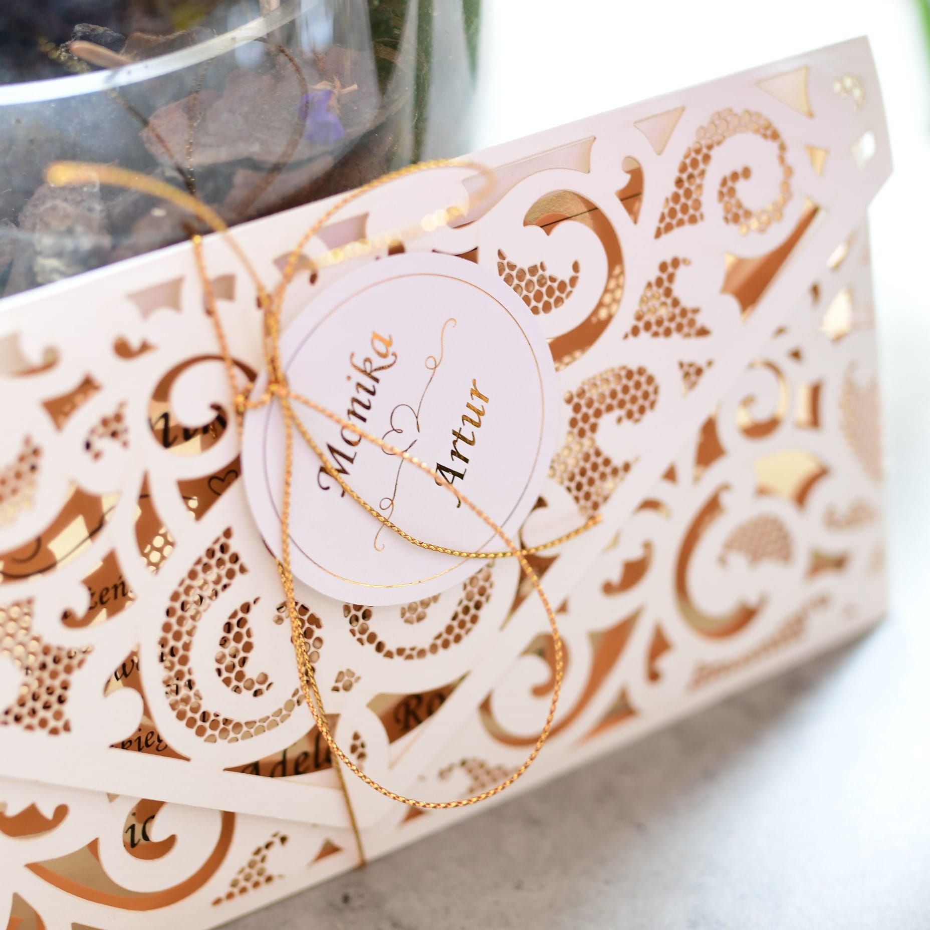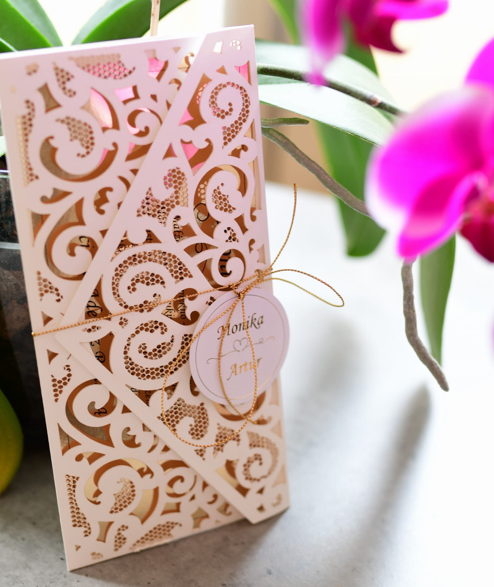 Ażurowa kartka z życzeniami z kopertą na pieniądze.