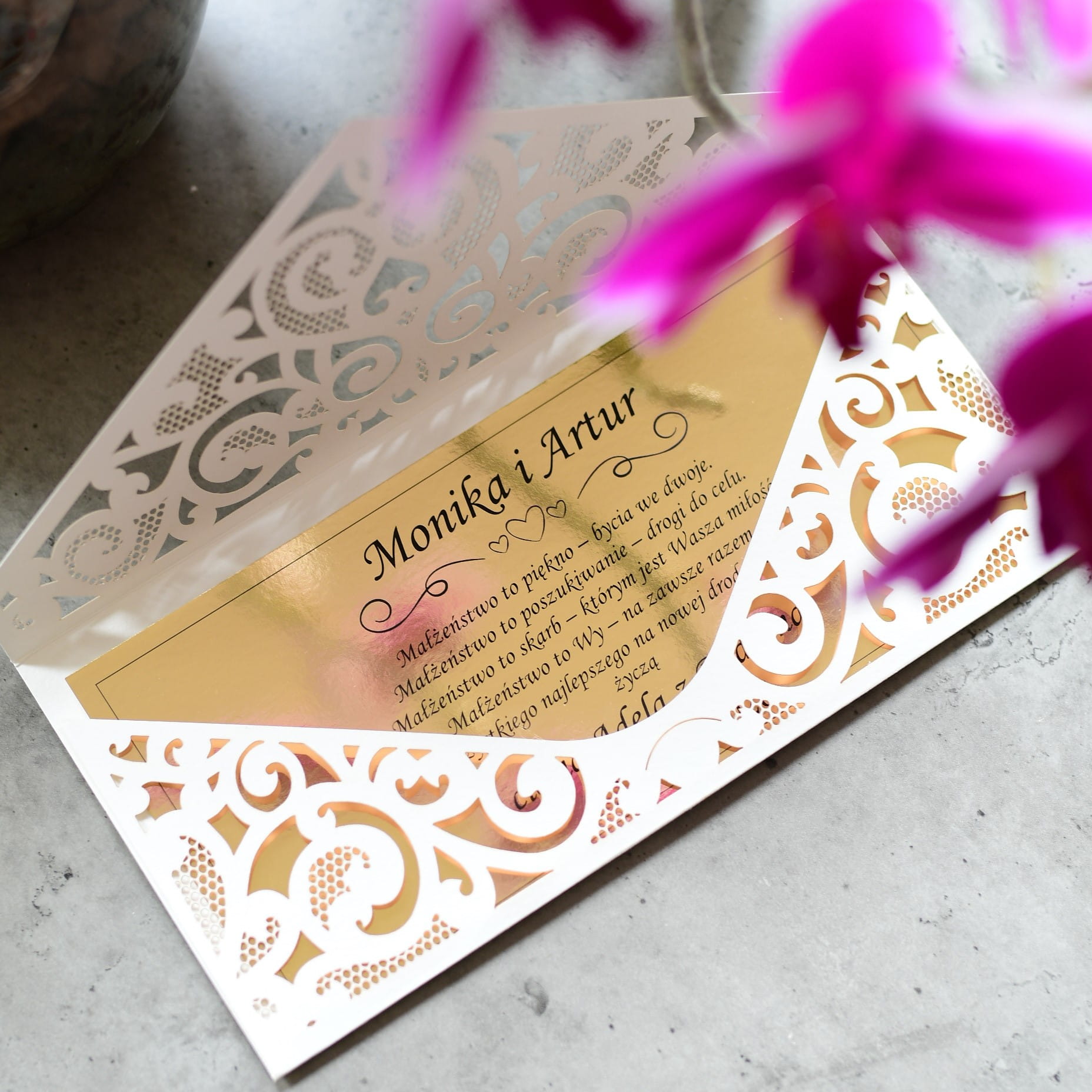 Wydruk Twoich życzeń oraz imion Pary Młodej i daty na złotej, lustrzanej karcie.