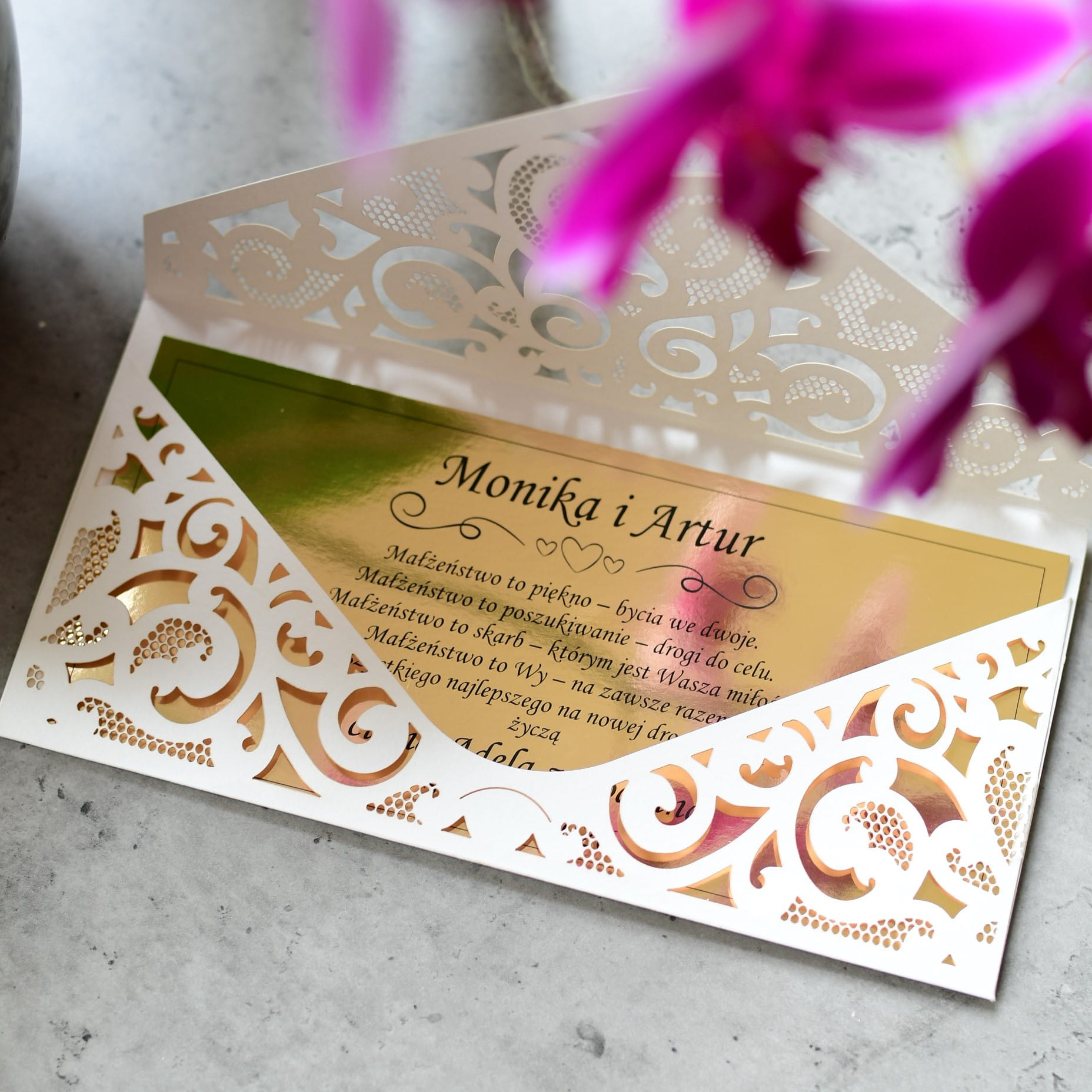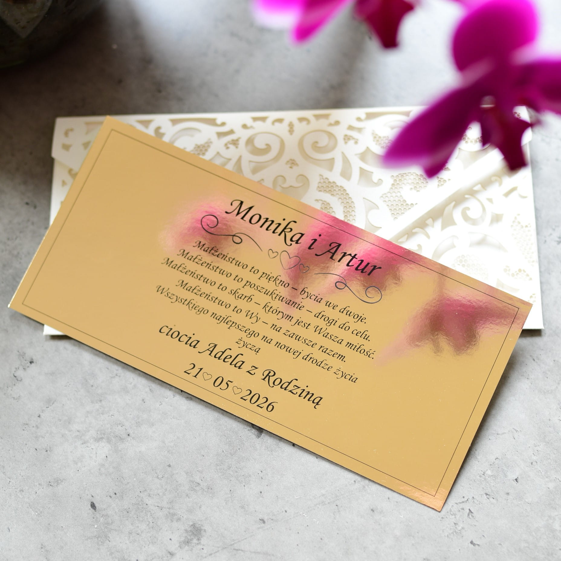 kartka glamour na pieniądze na wesele z Twoimi życzeniami - wzór nr 15 - elegancka złota koronkowa