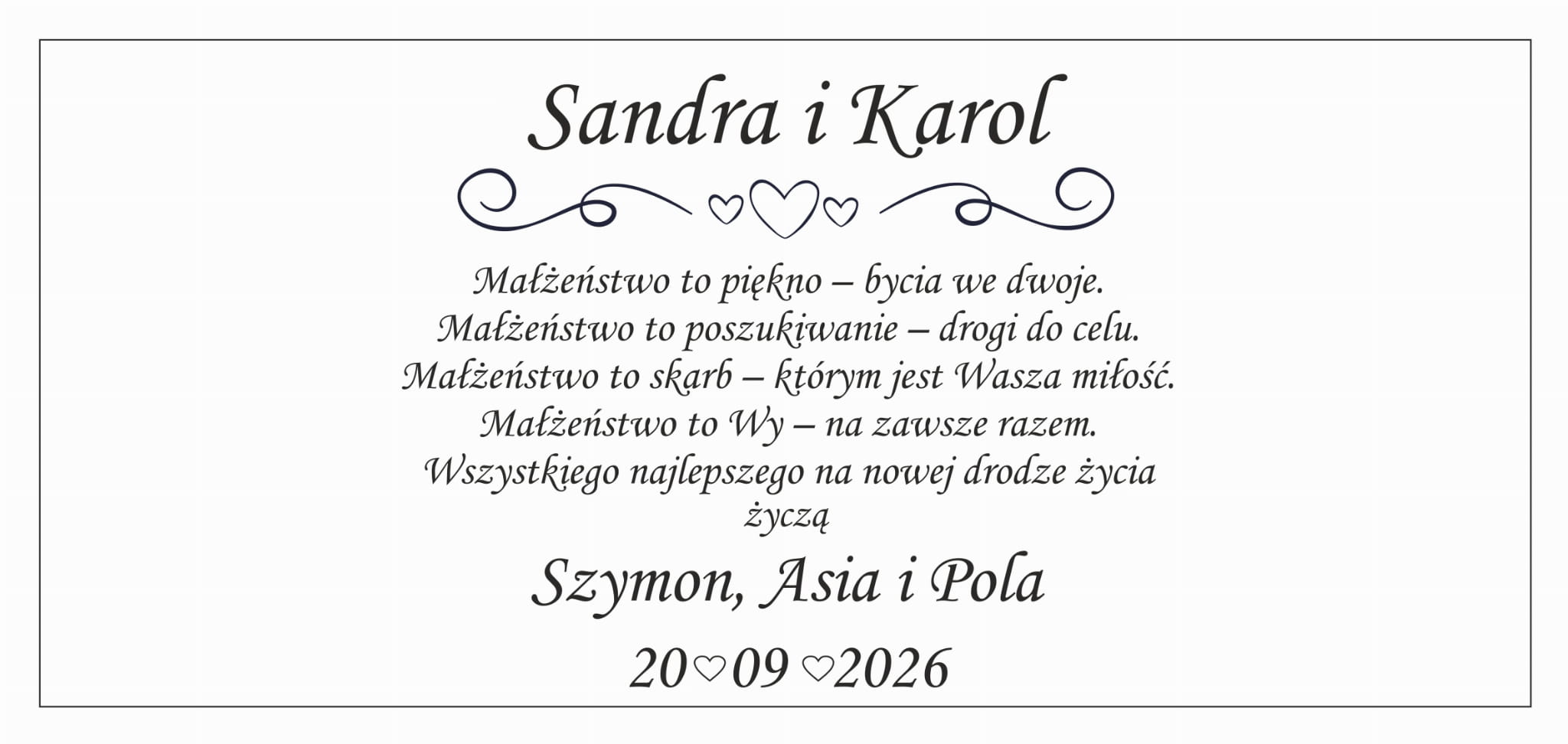 √ personalizacja w cenie (wydruk imion pary młodej, daty, od kogo są życzenia);