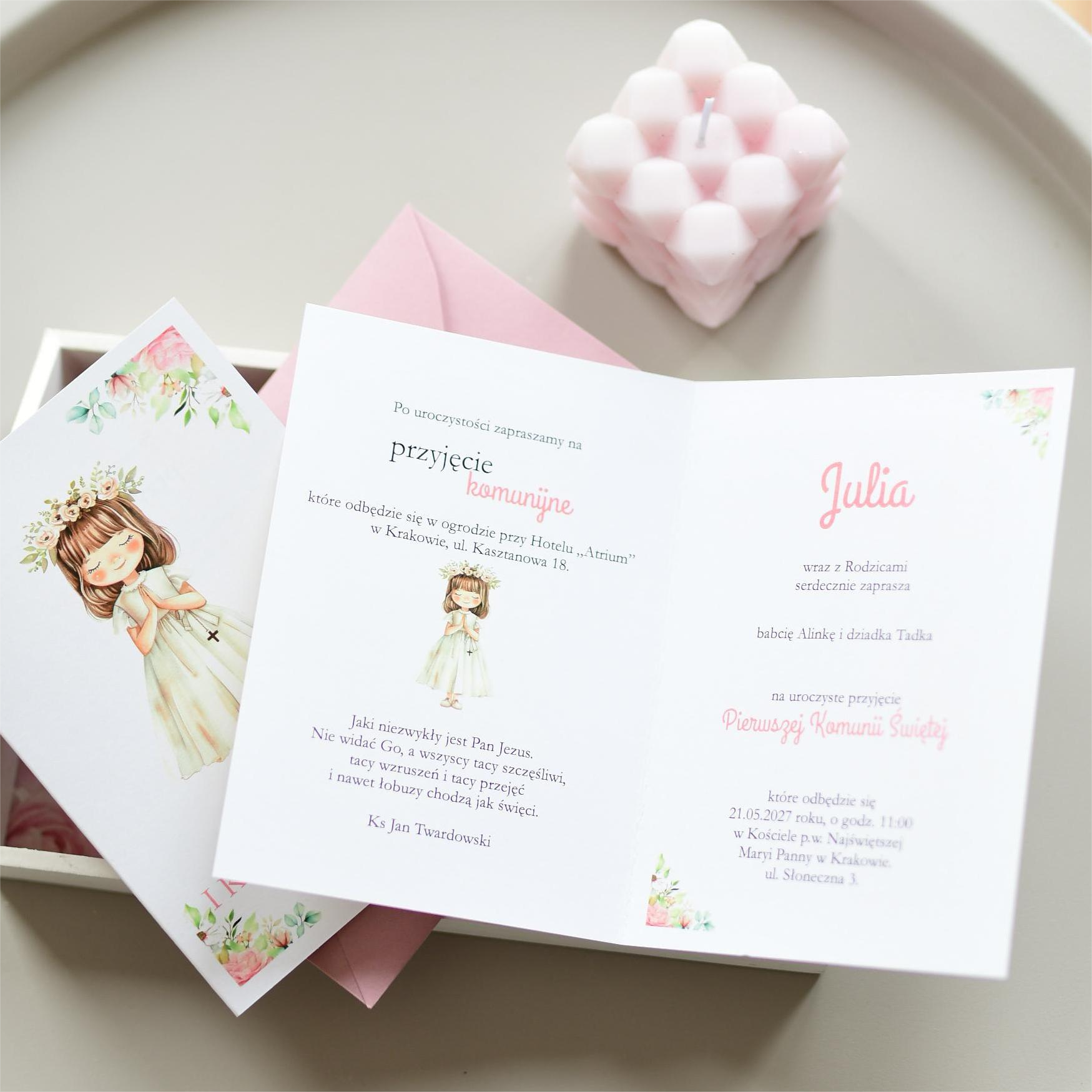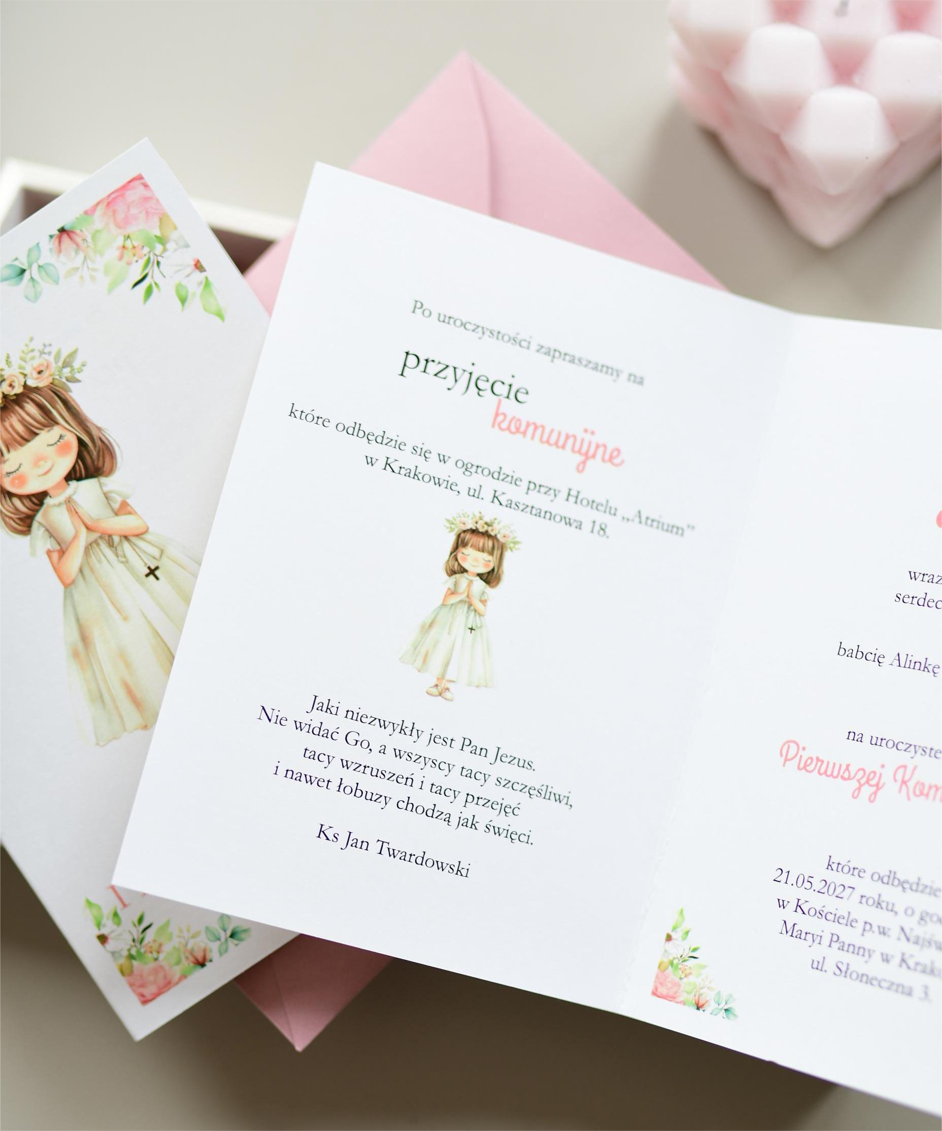 Kwiatowe zaproszenia na komunie świętą z dziewczynką.