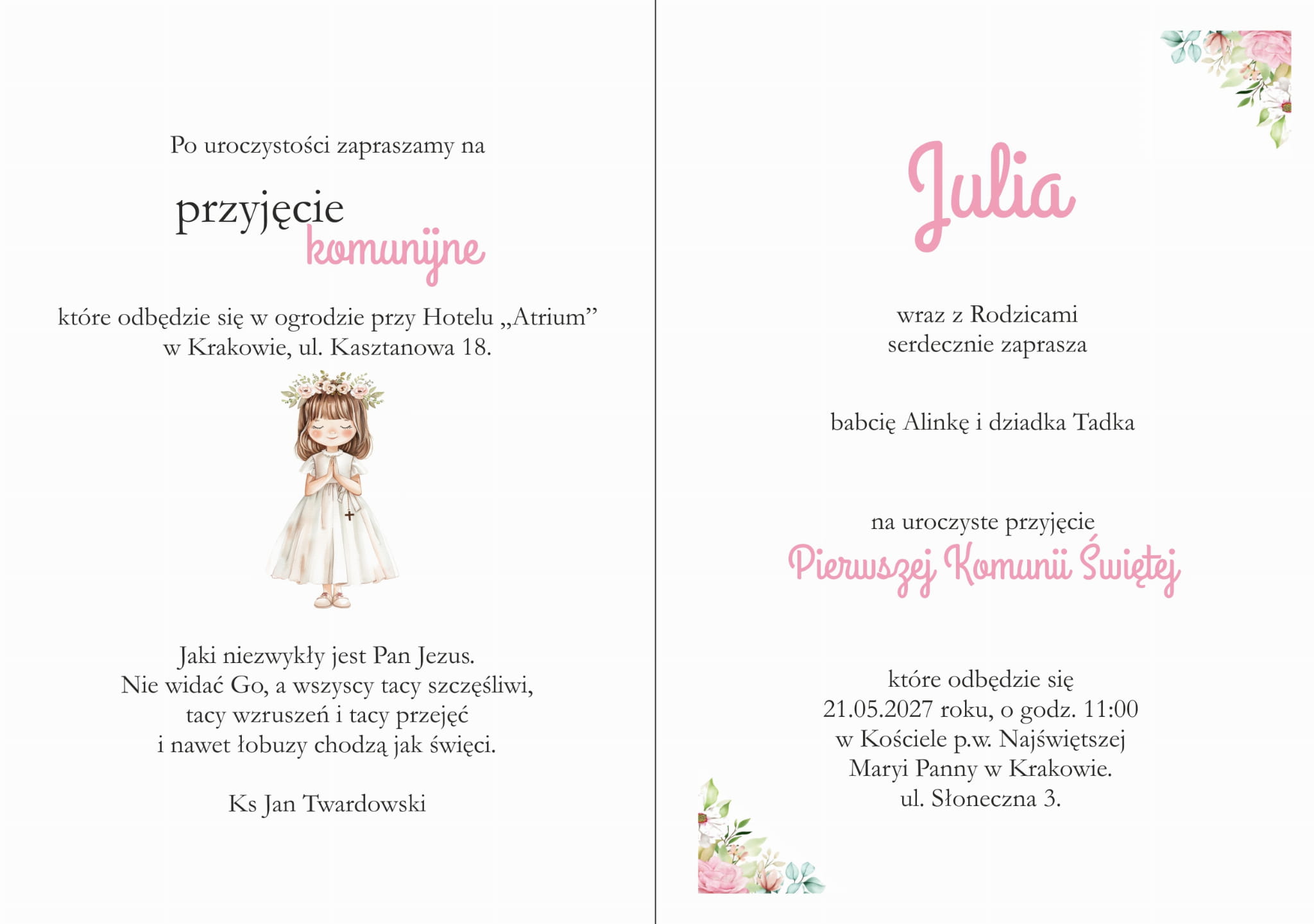 kwiatowe zaproszenia na komunie świętą z dziewczynką (minimalne zamówienie 10 szt.)