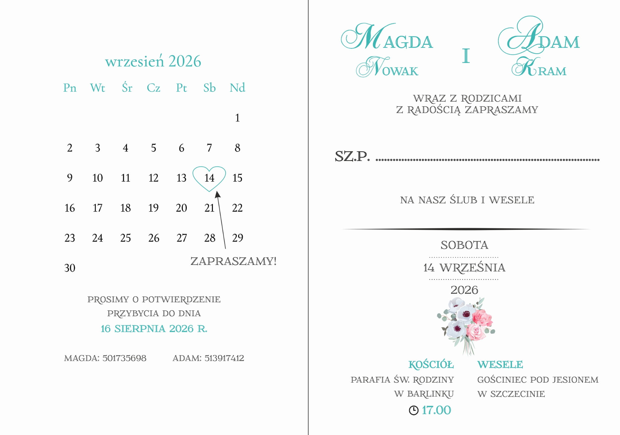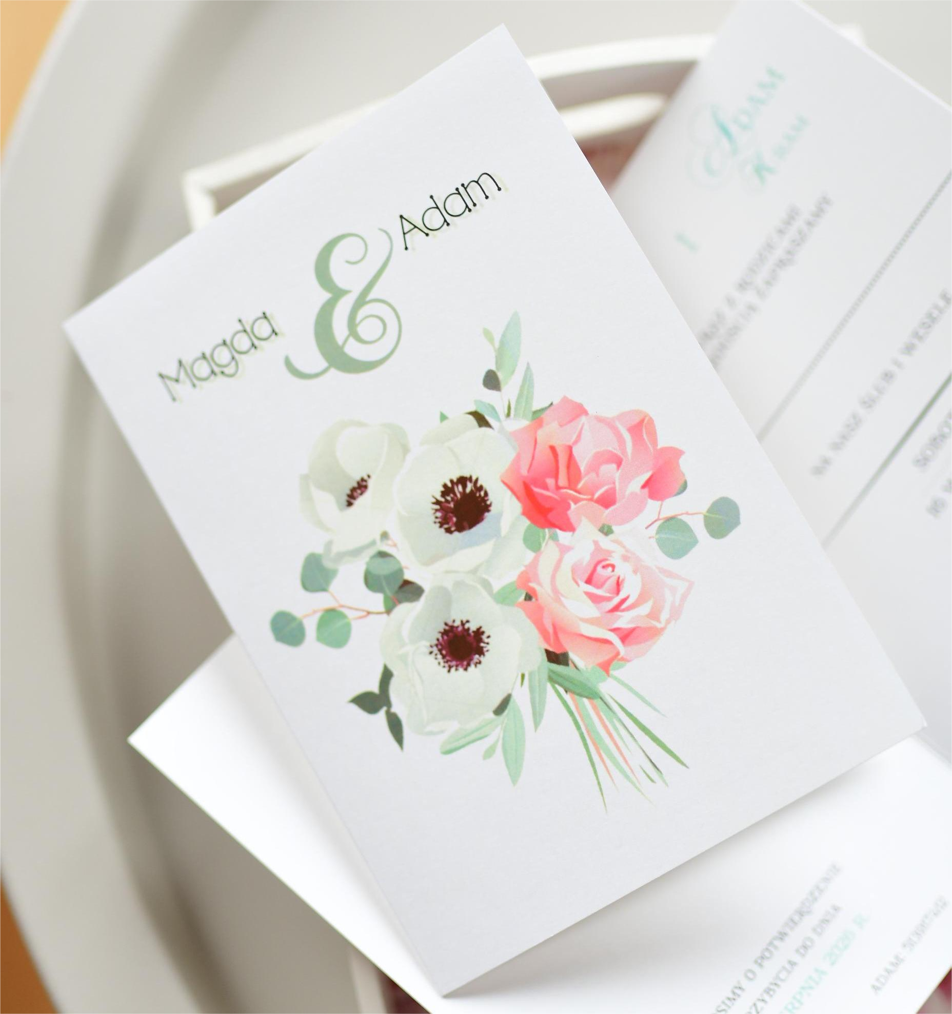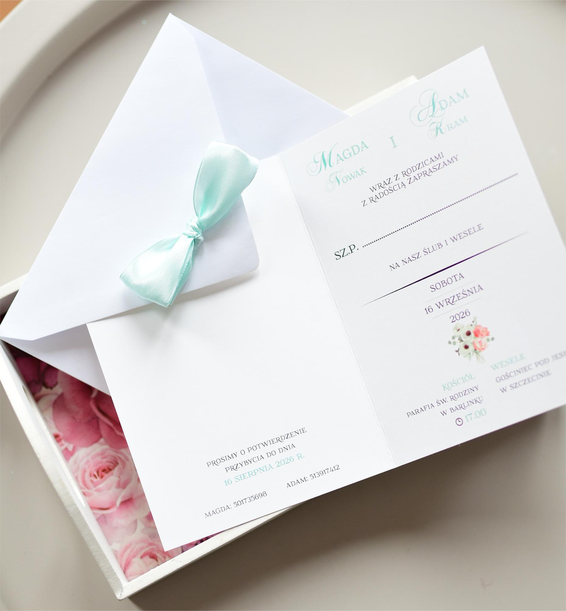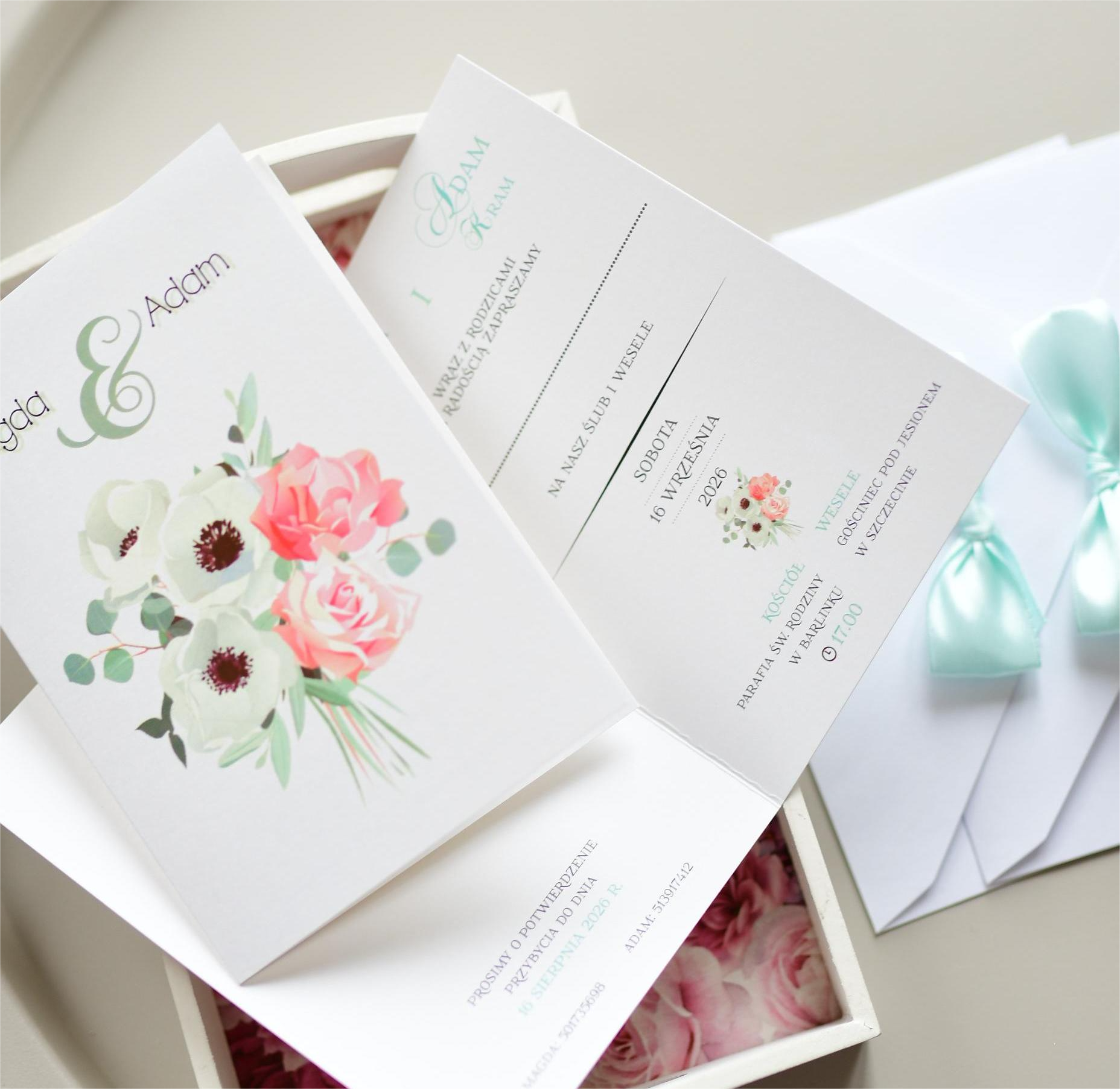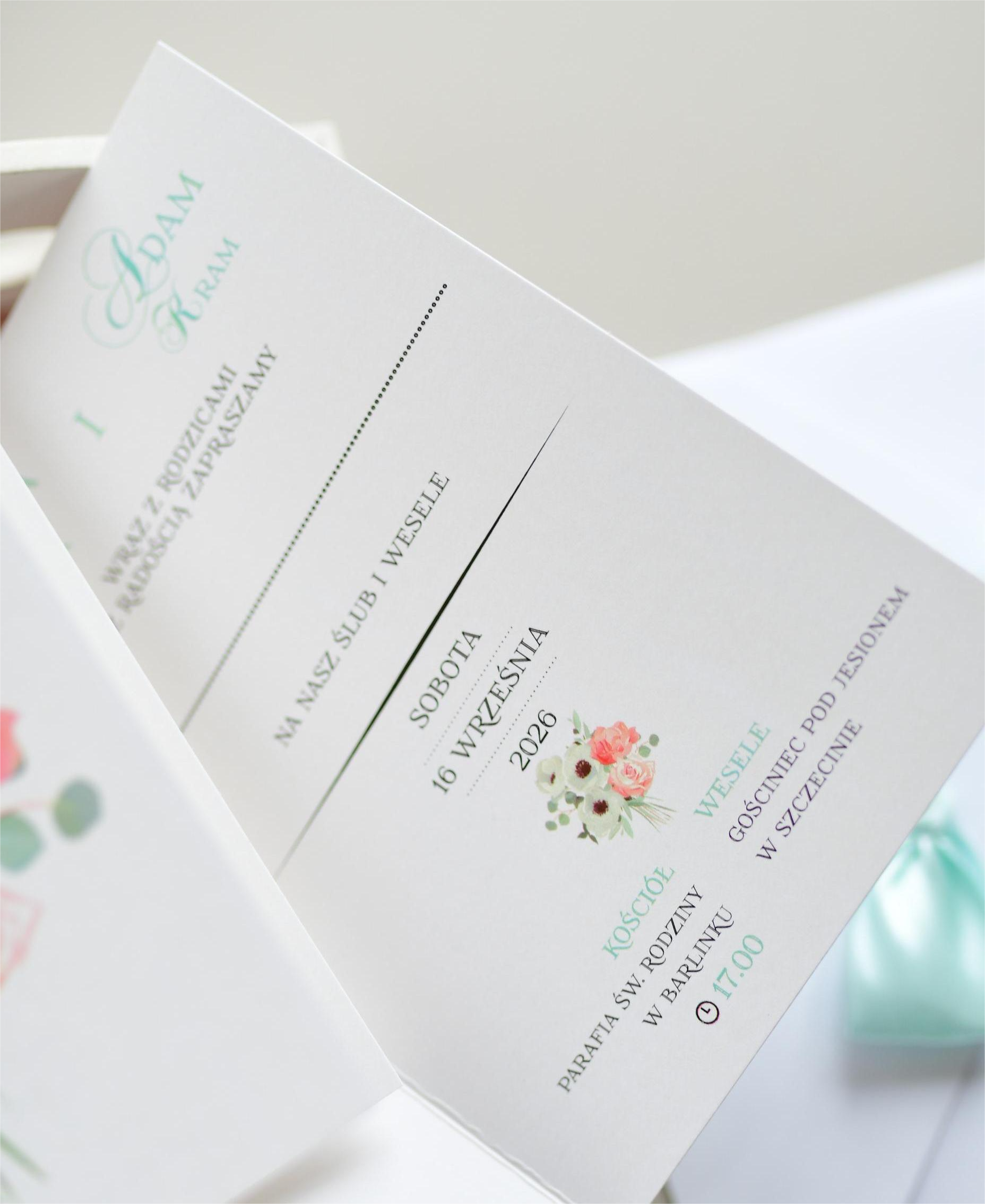 Miętowe zaproszenia weselne ze ślicznym motywem bukietu ślubnego!