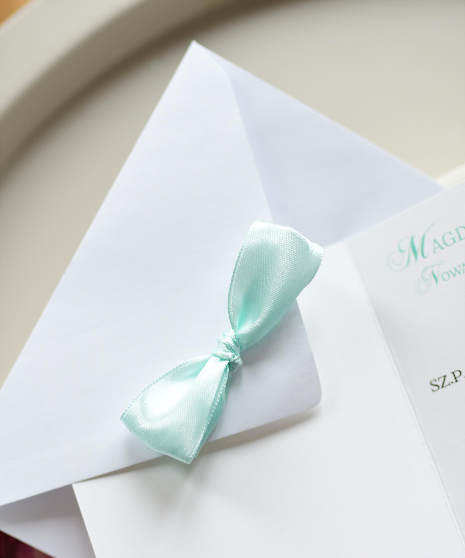 √ biała koperta gratis; możliwość domówienia koperty z dużą, ozdobą kokardką w kolorze miętowym (widoczną na zdjęciach).