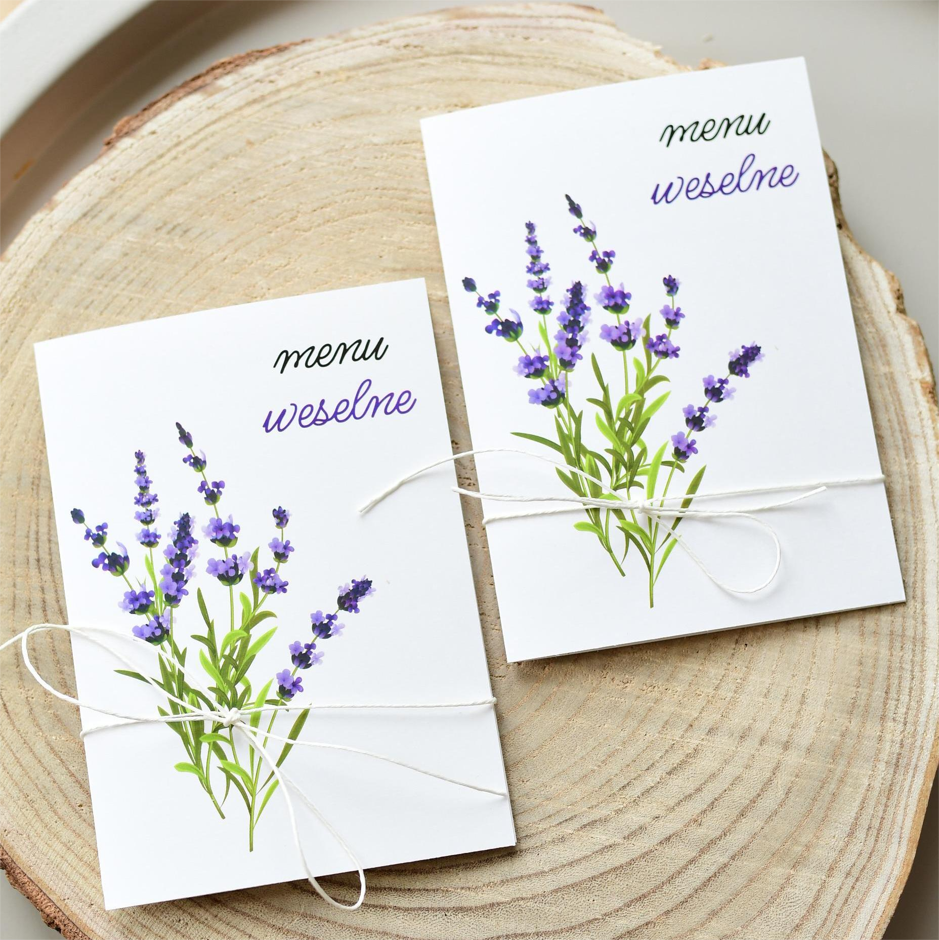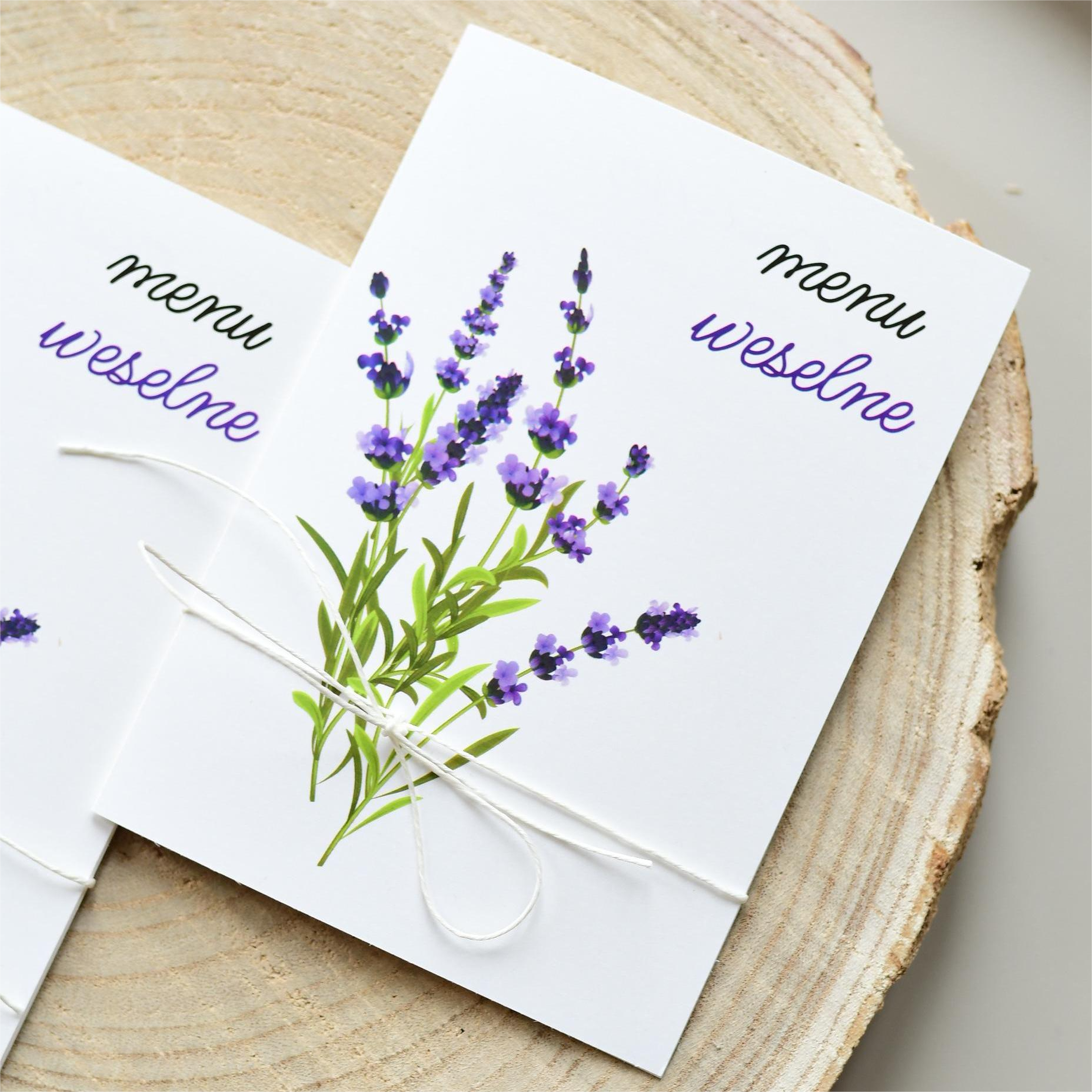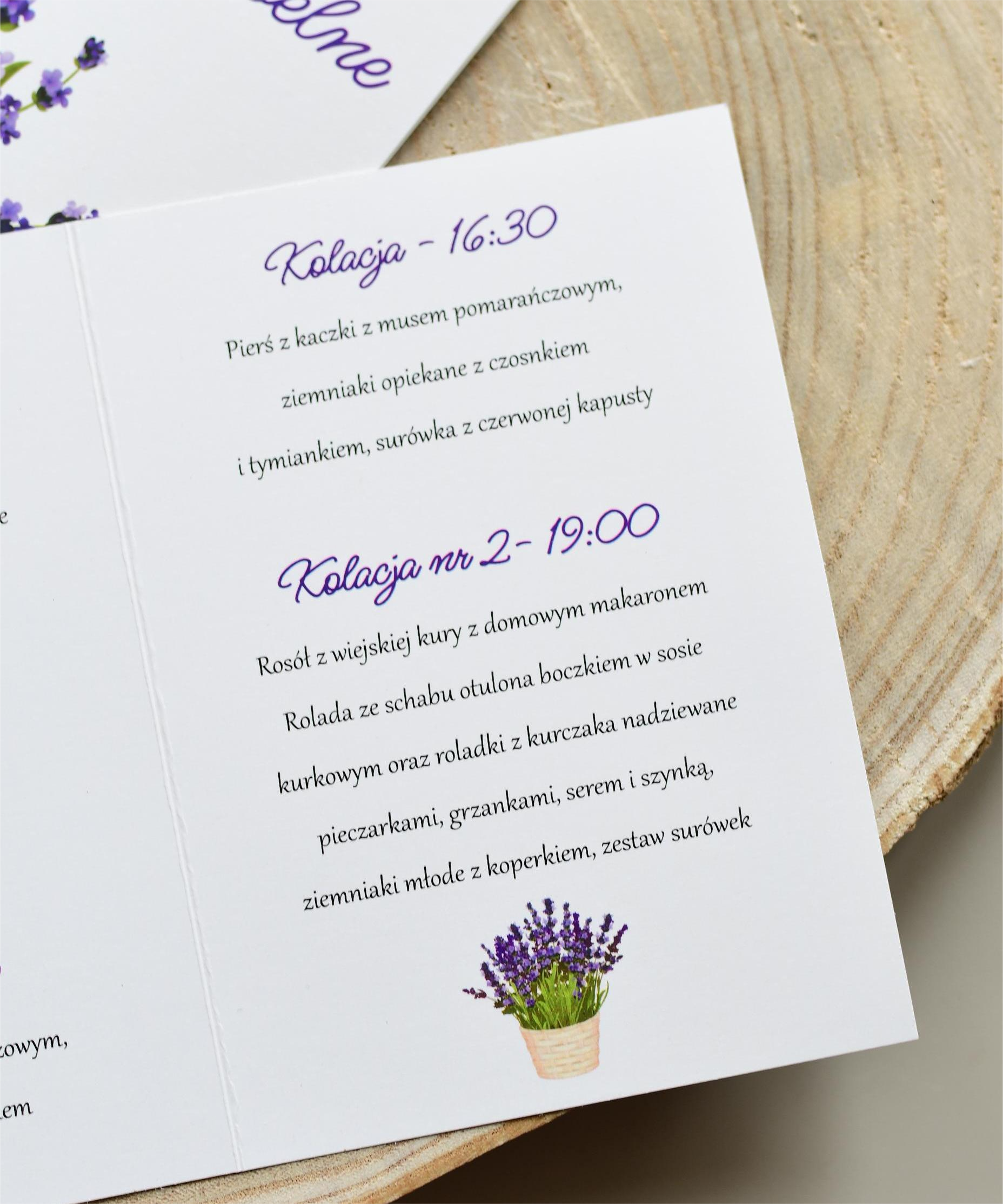 Lawendowe, otwierane menu na rustykalne wesele.