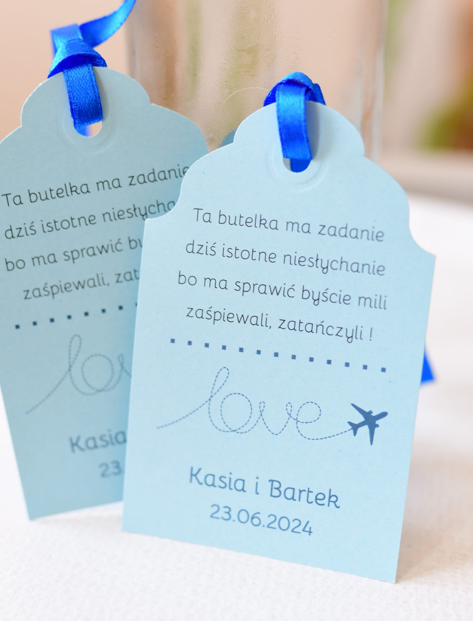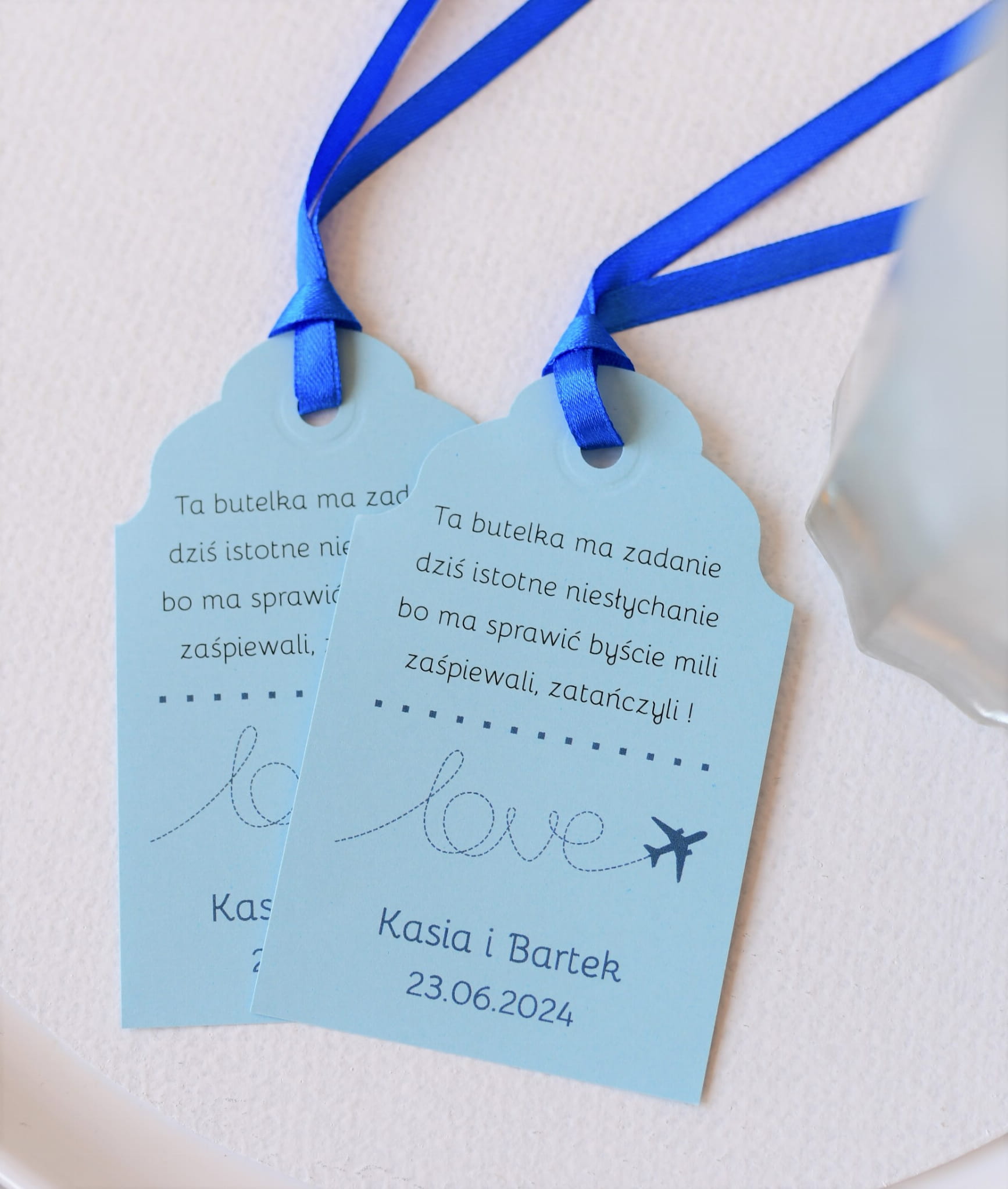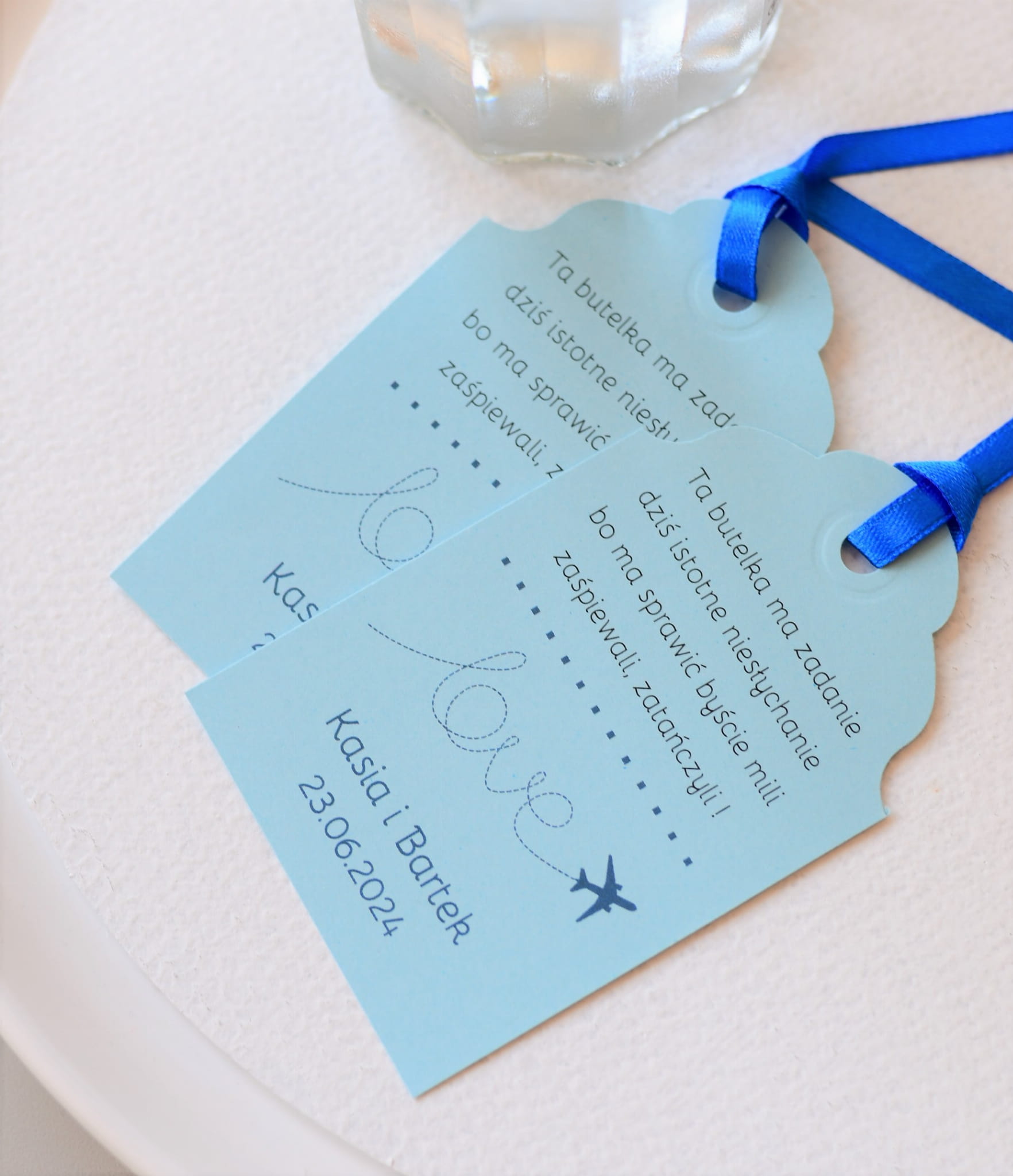 Niebieskie zawieszki na wódkę weselną z motywem samolotu LOVE.