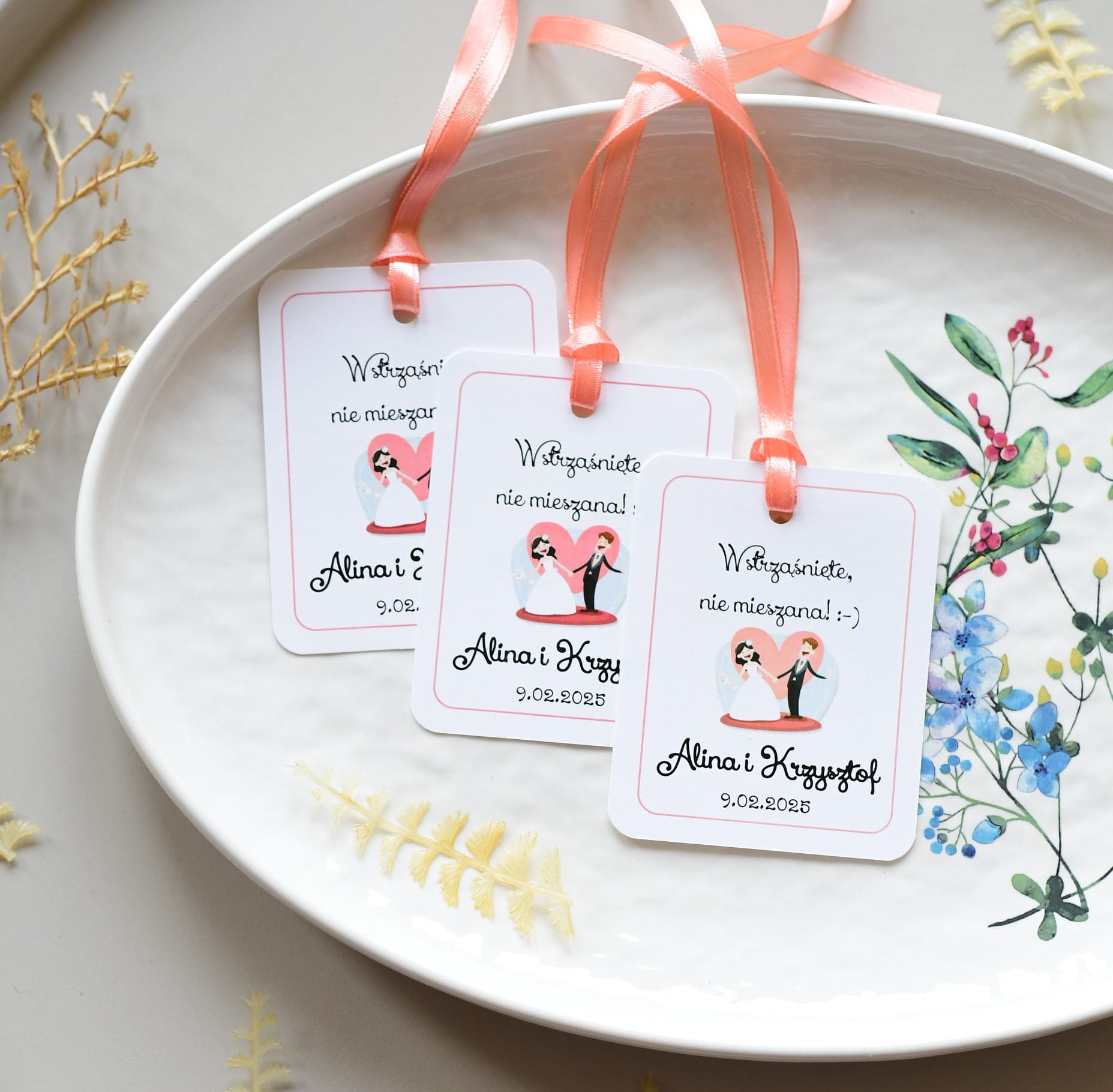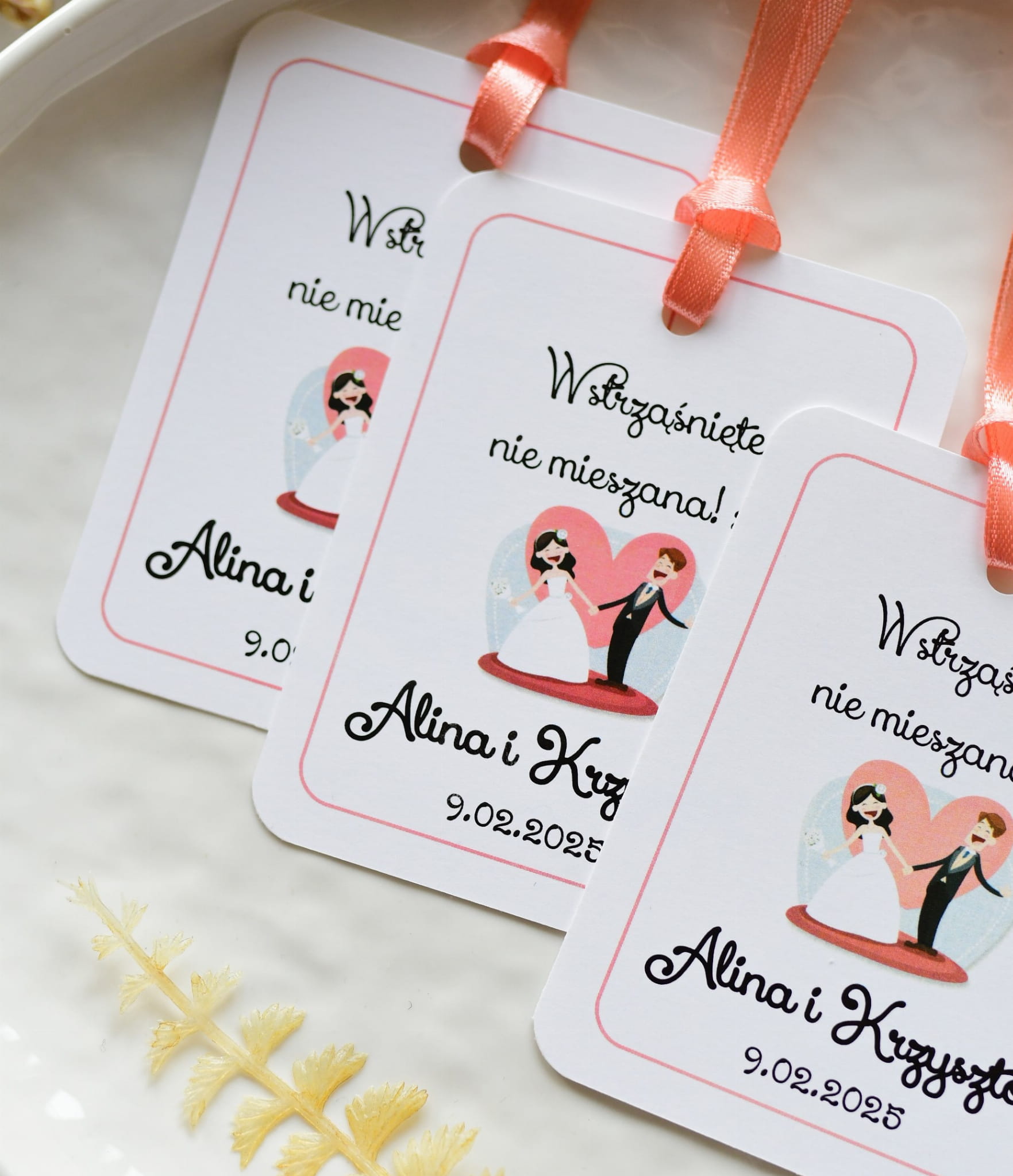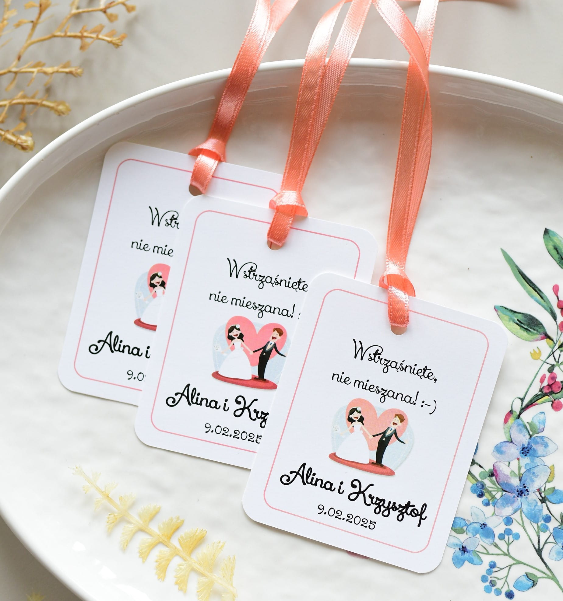 Nowoczesne zawieszki na wódkę weselną z grafiką Pary Młodej - hit!