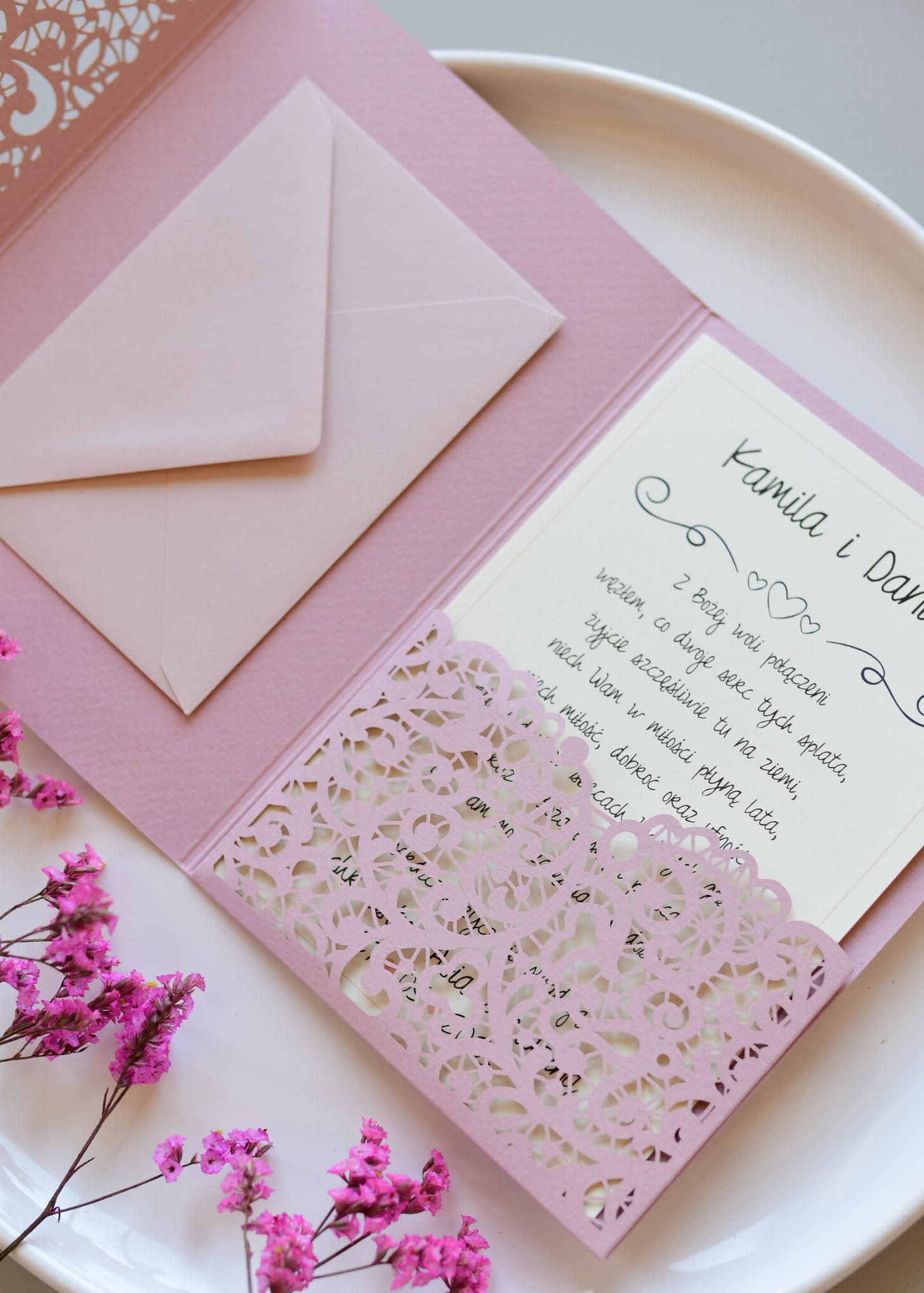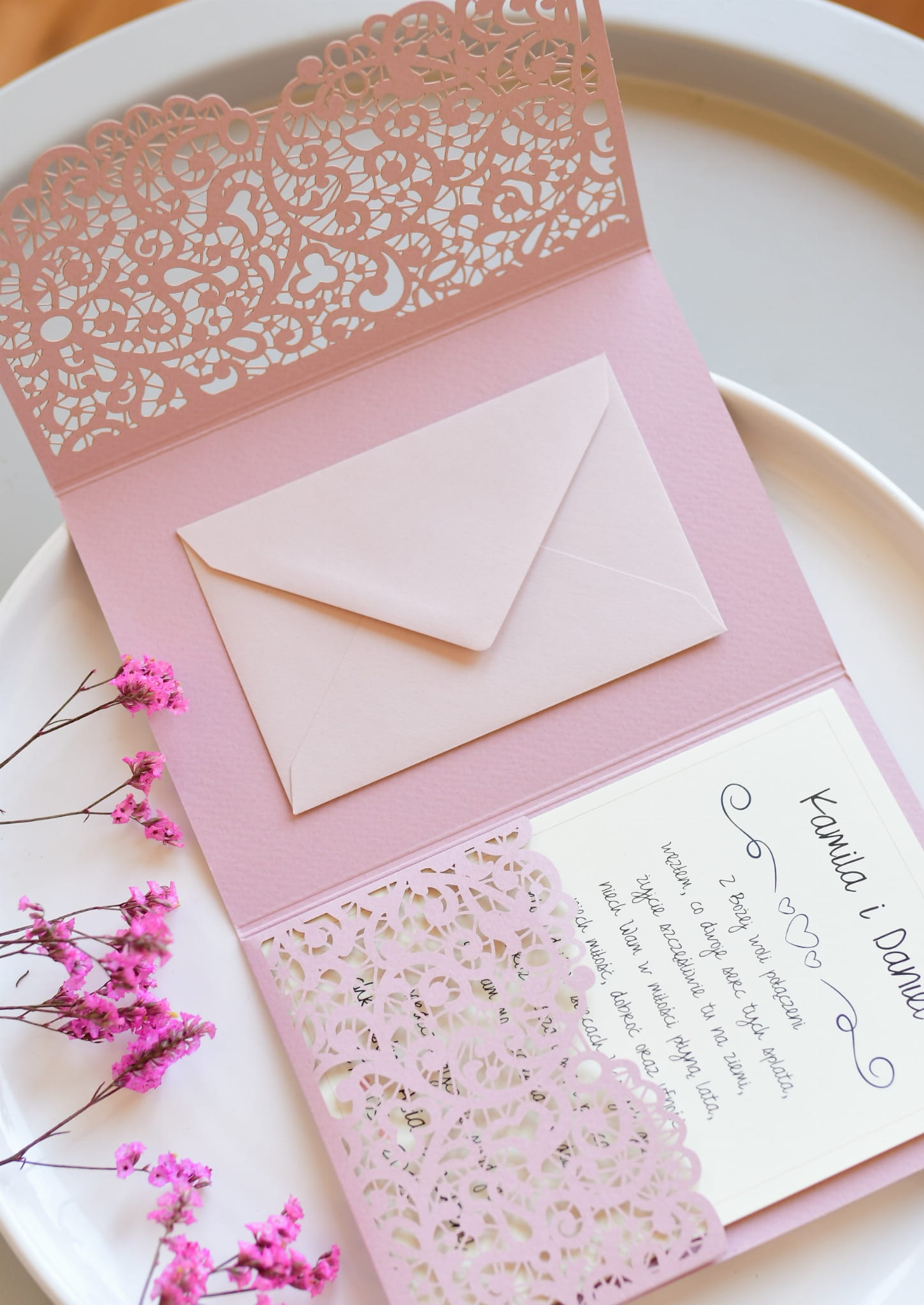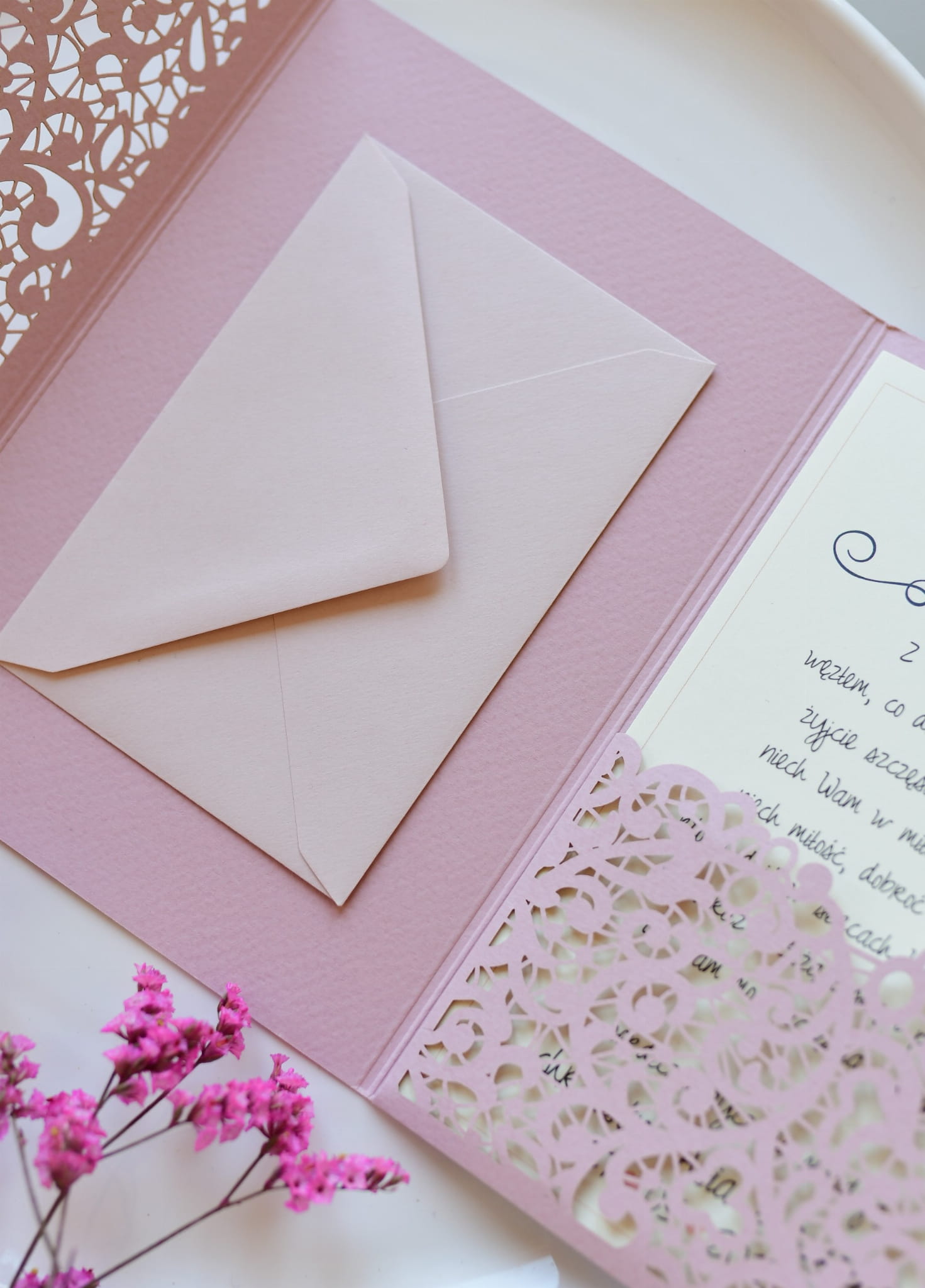 W środku znajduje się mała różowa koperta na prezent weselny - pieniądze.