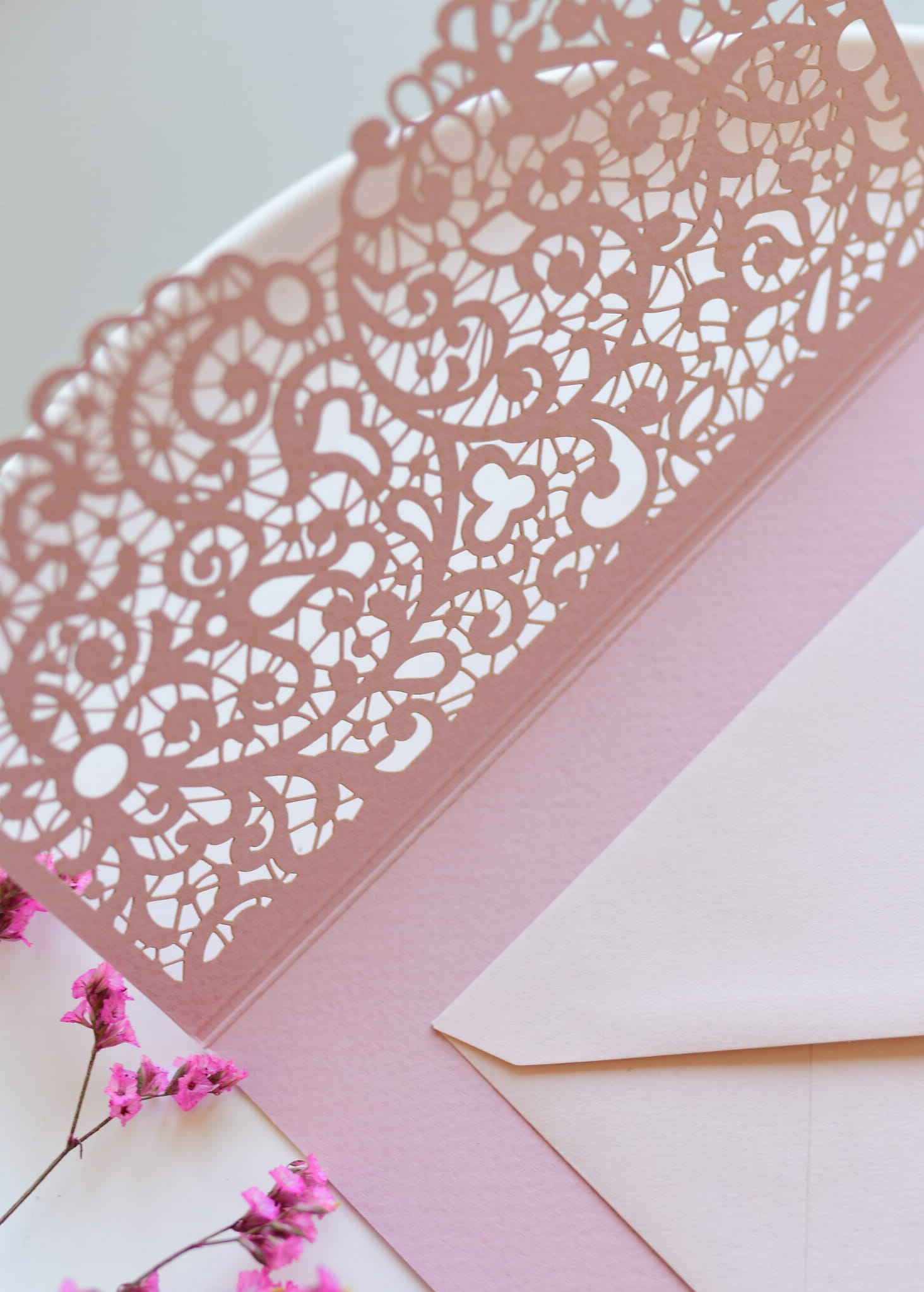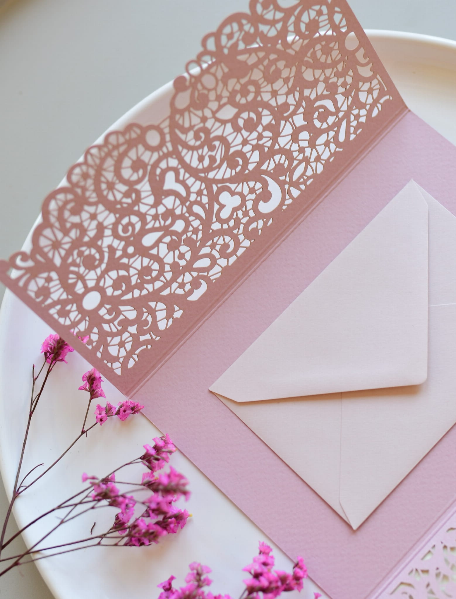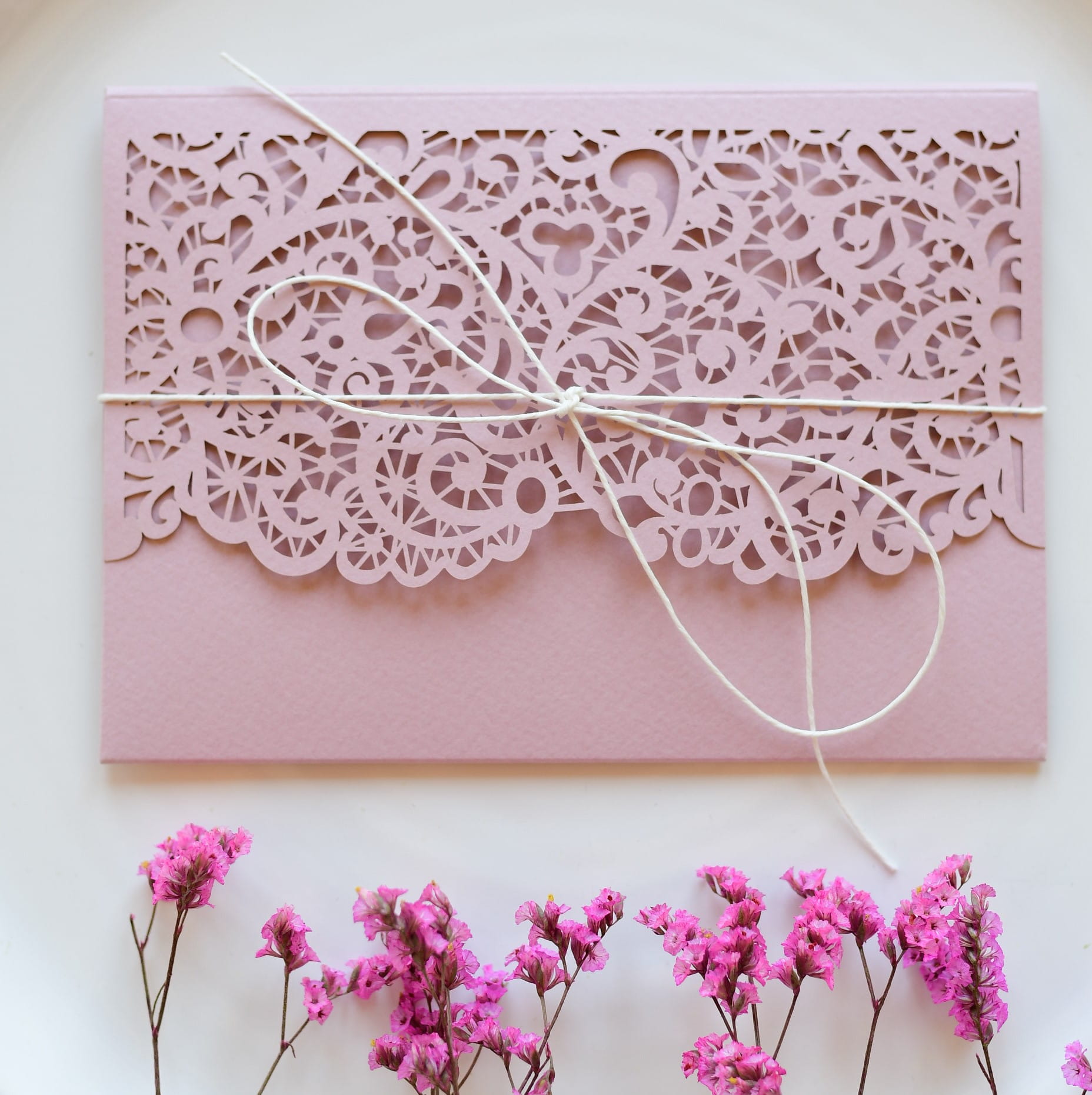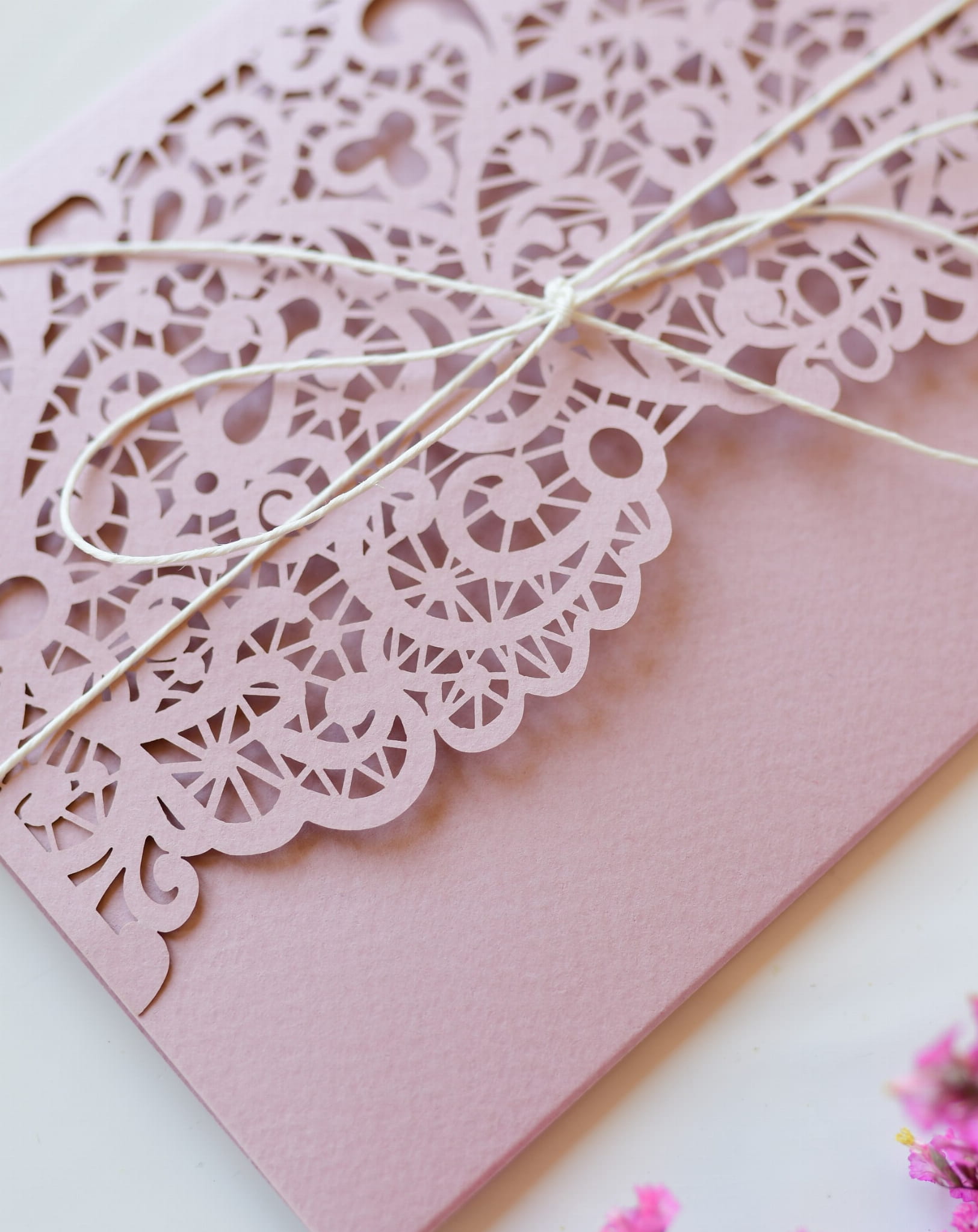 W środku znajduje się mała różowa koperta na prezent weselny - pieniądze.