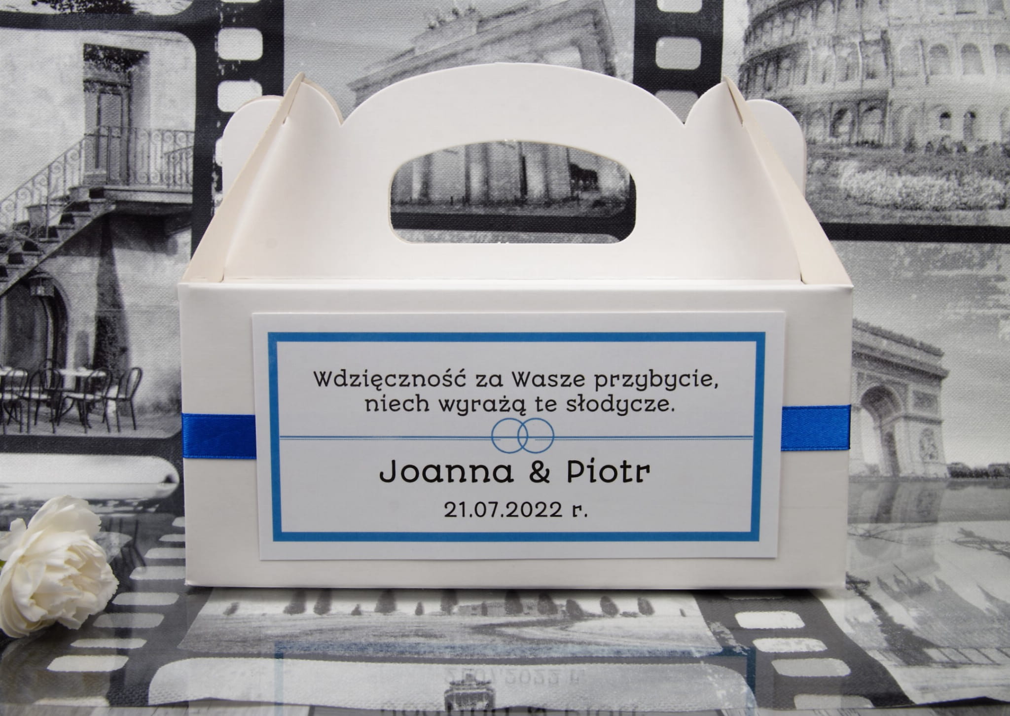 Spersonalizowane pudełka na ciasto weselne.