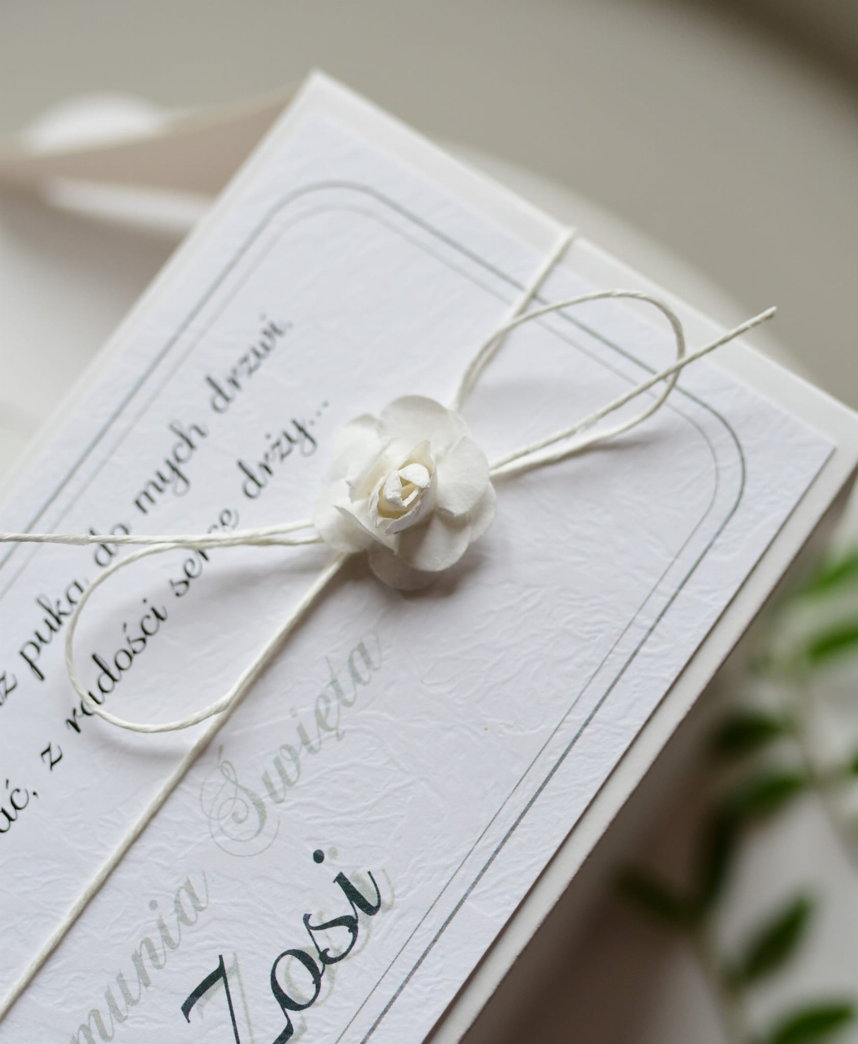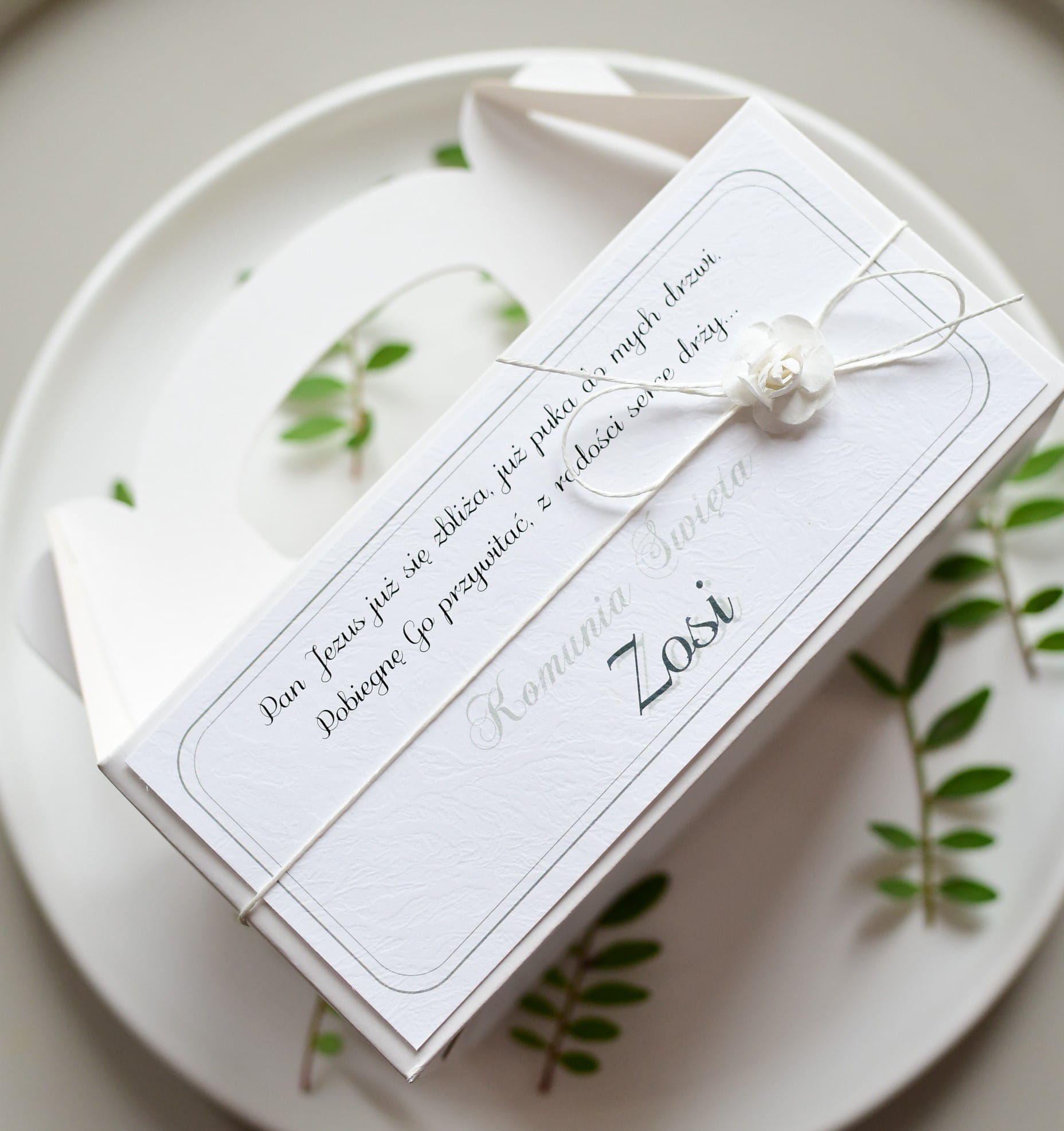 Delikatny, typowo komunijny wzór z białą różyczką oraz sznurkiem bielonym.