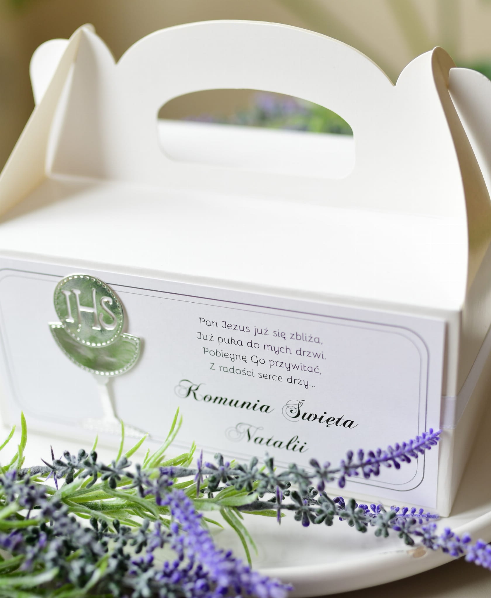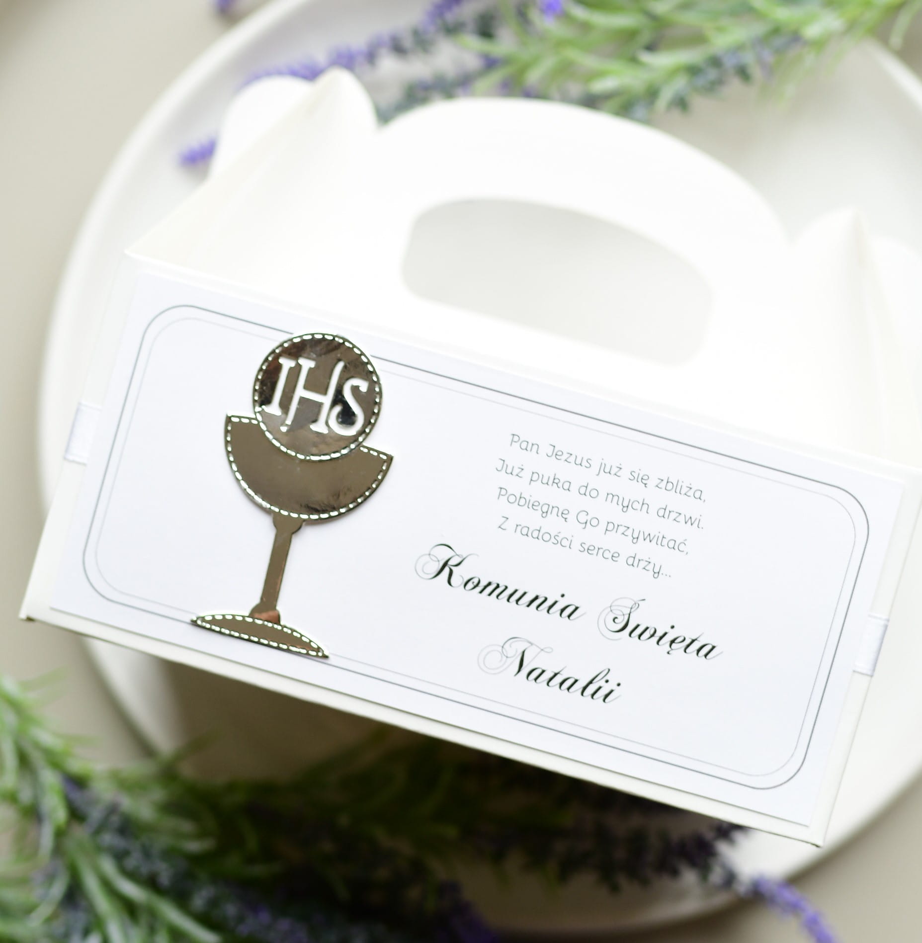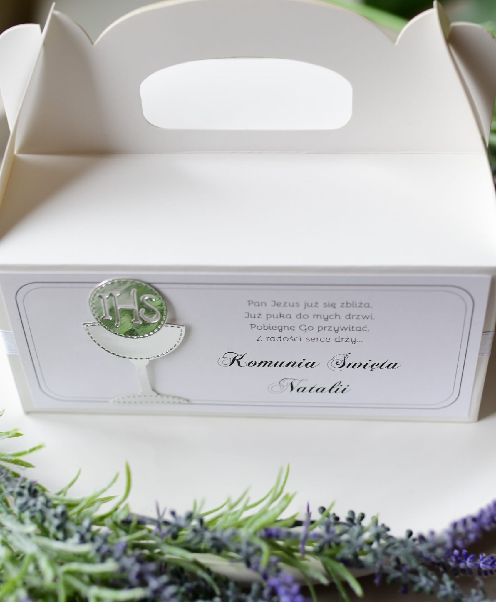 praktyczne srebrne pudełka na ciasto komunijne IHS z imieniem dziecka (minimalne zamówienie 15 szt.)