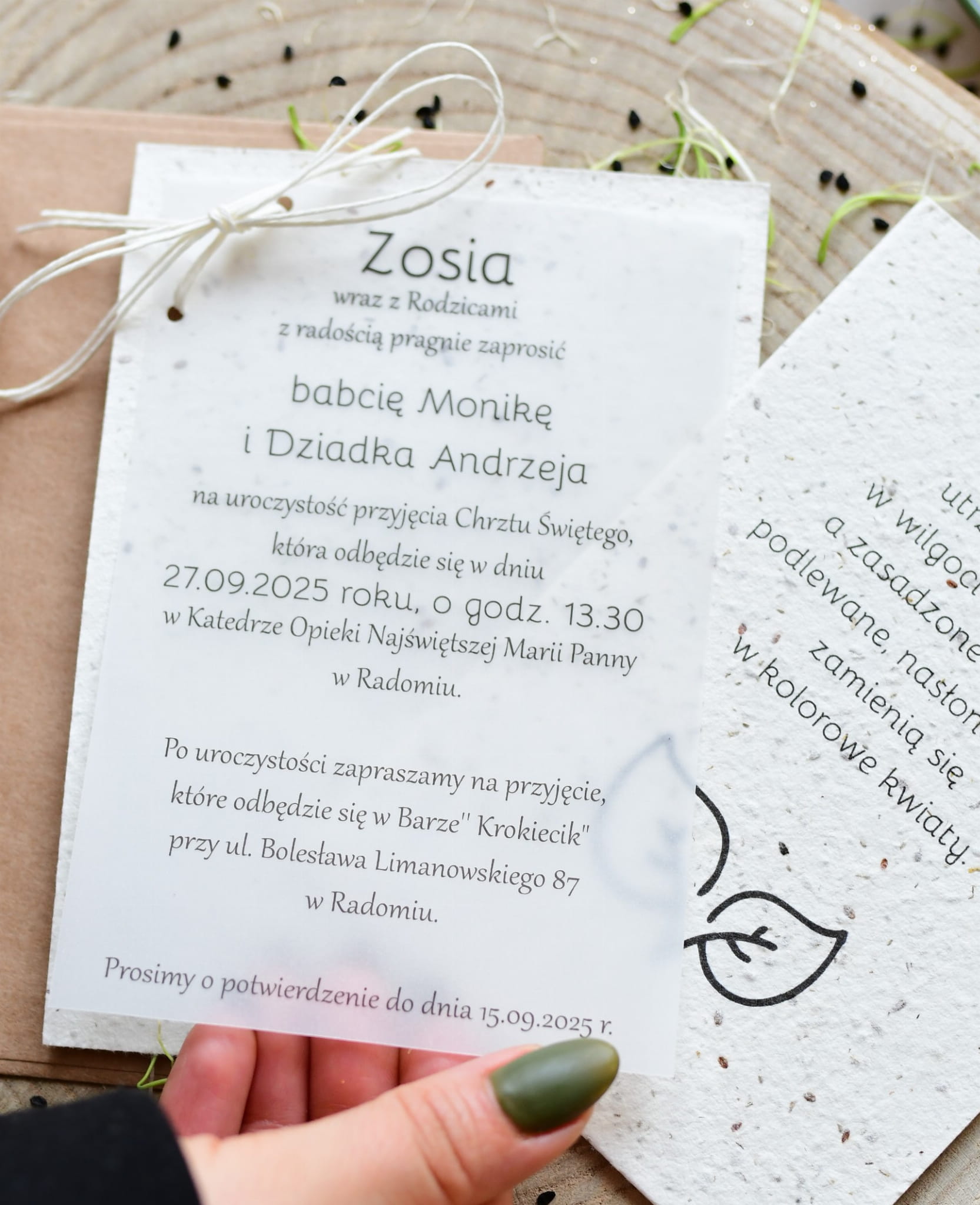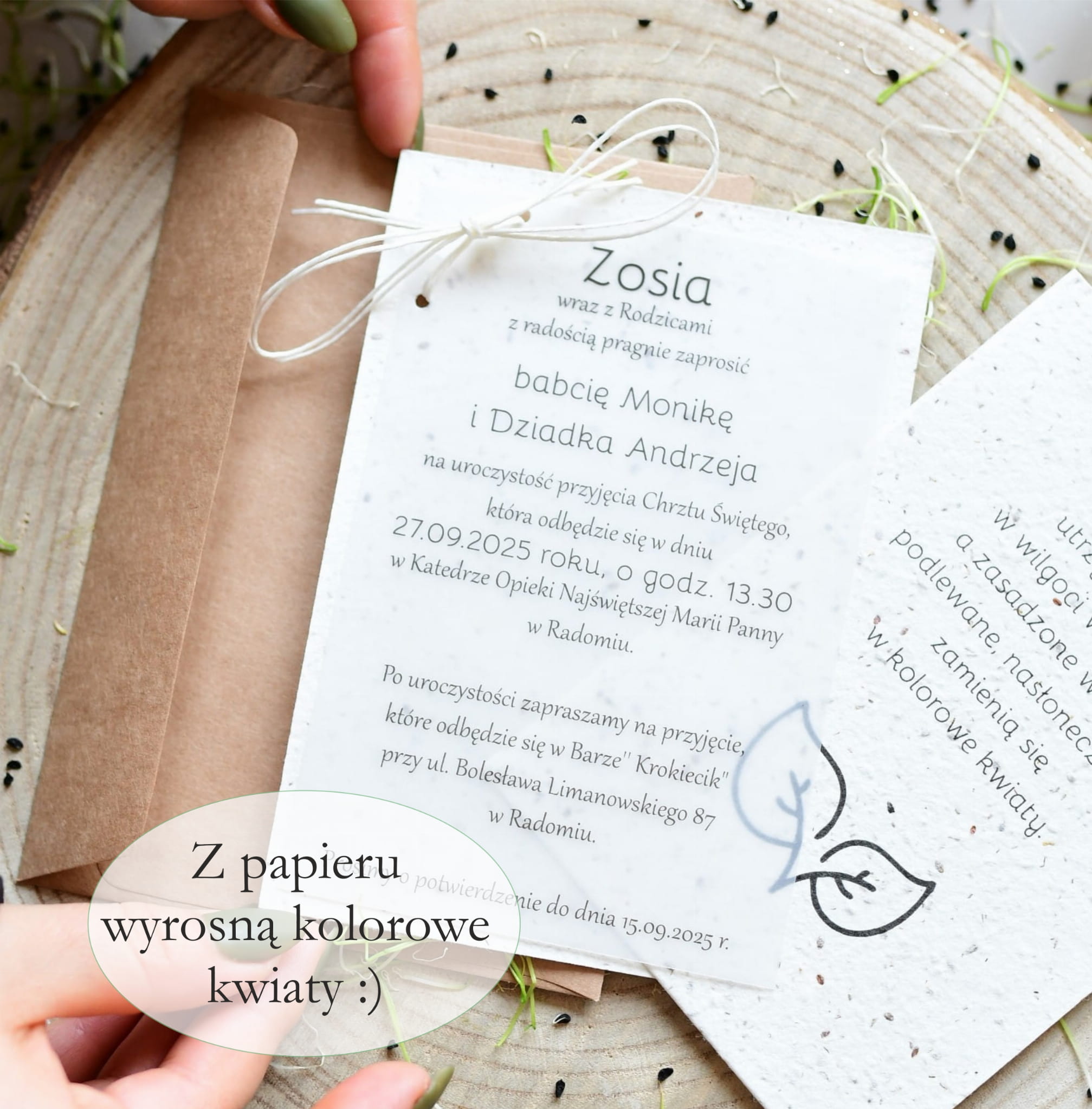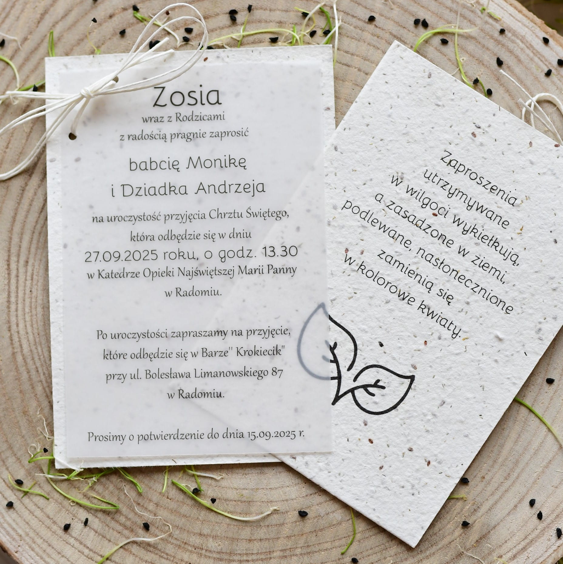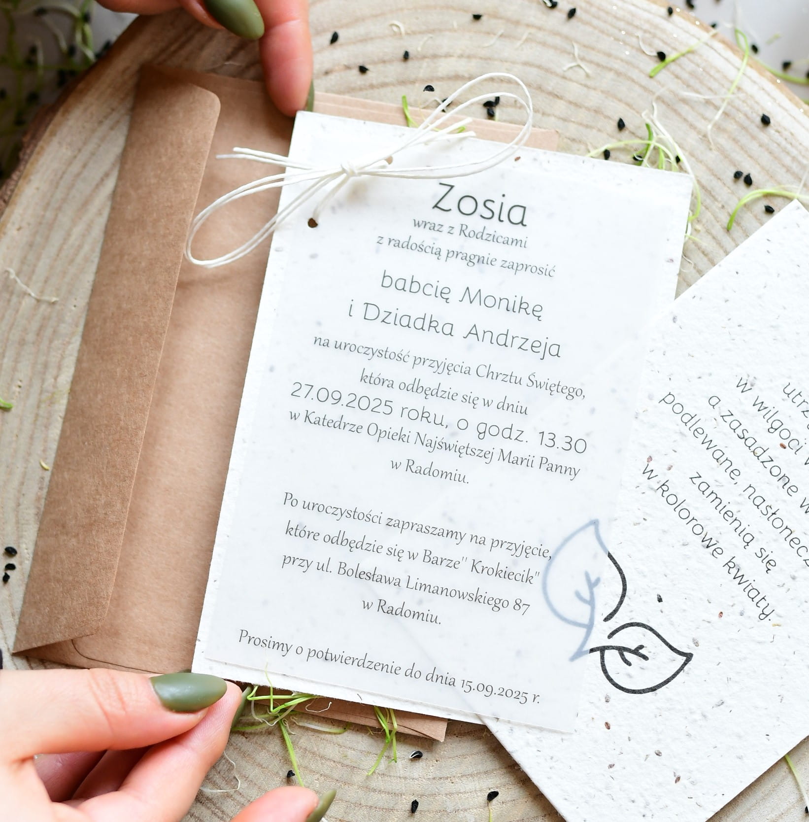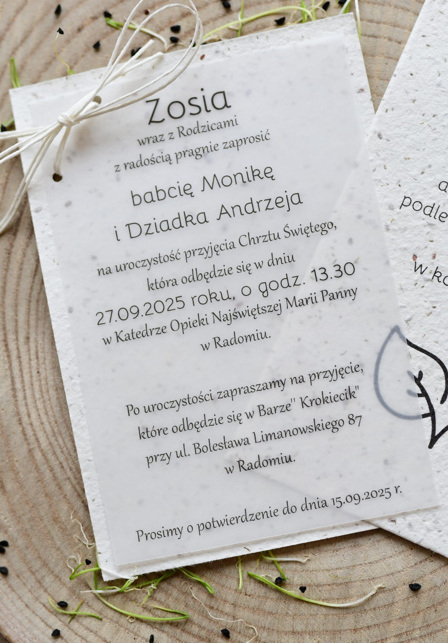 Zaproszenia na Chrzest Święty z rosnącego papieru z nasionkami roślin + ozdobna kalka.