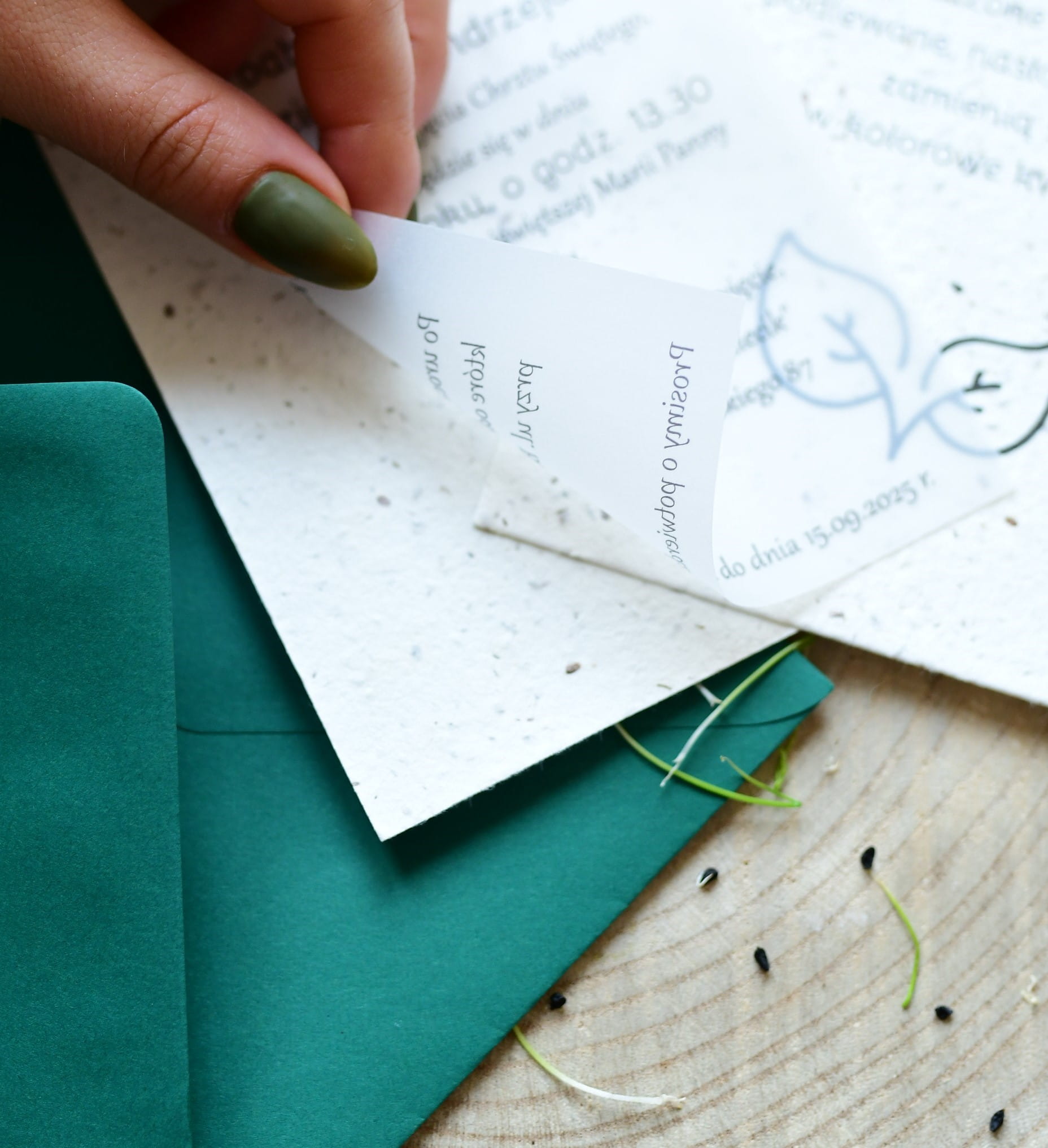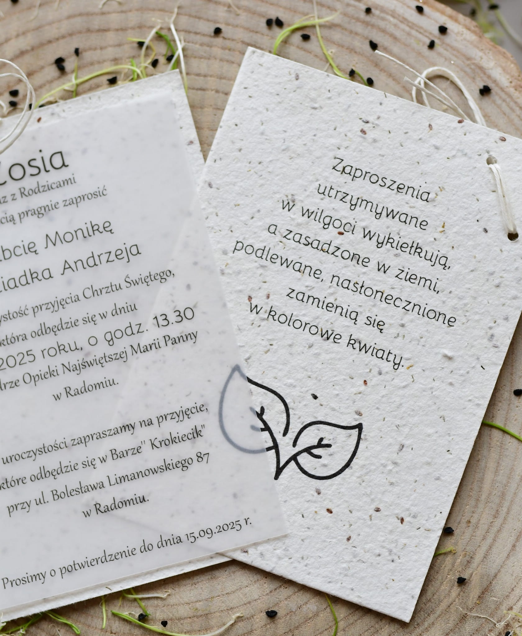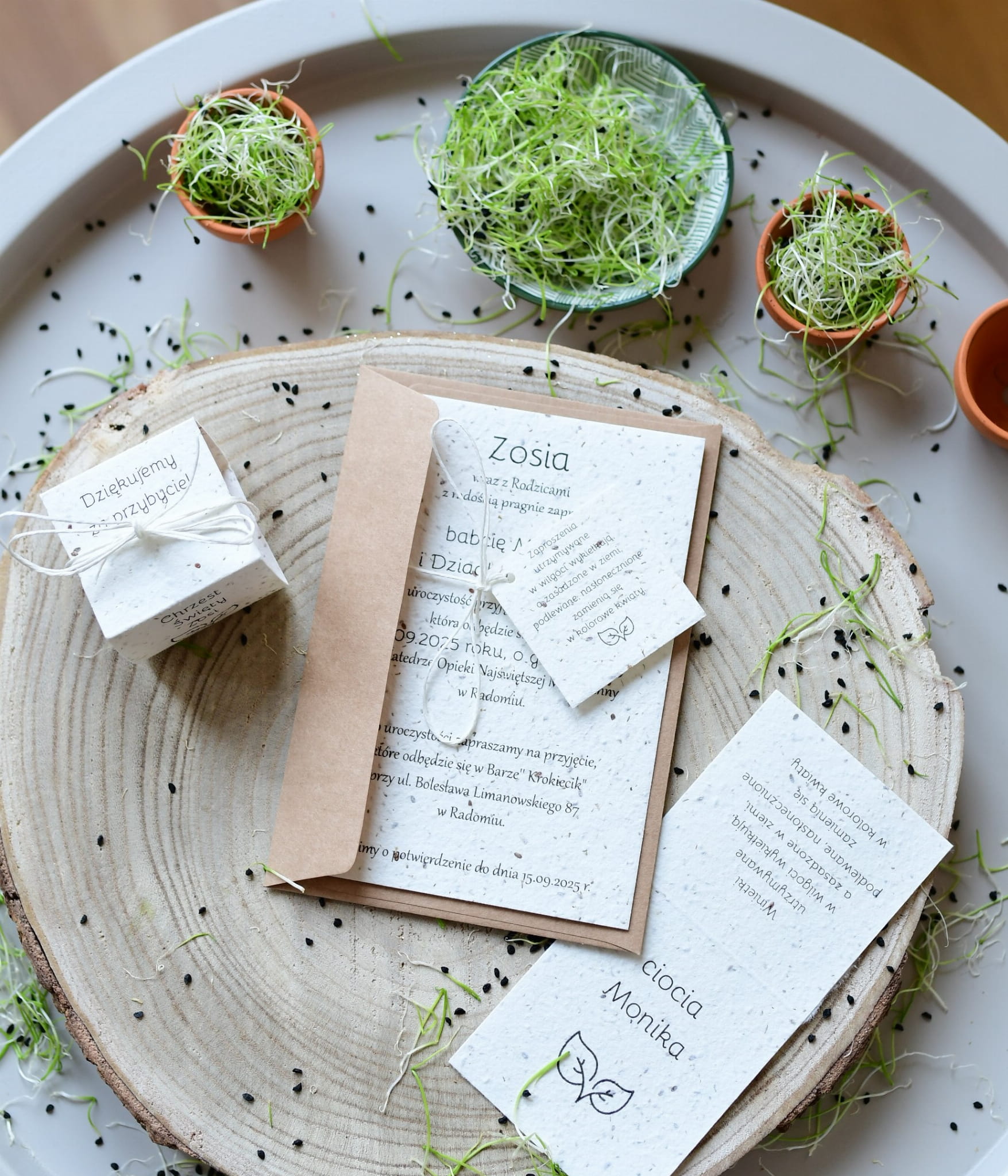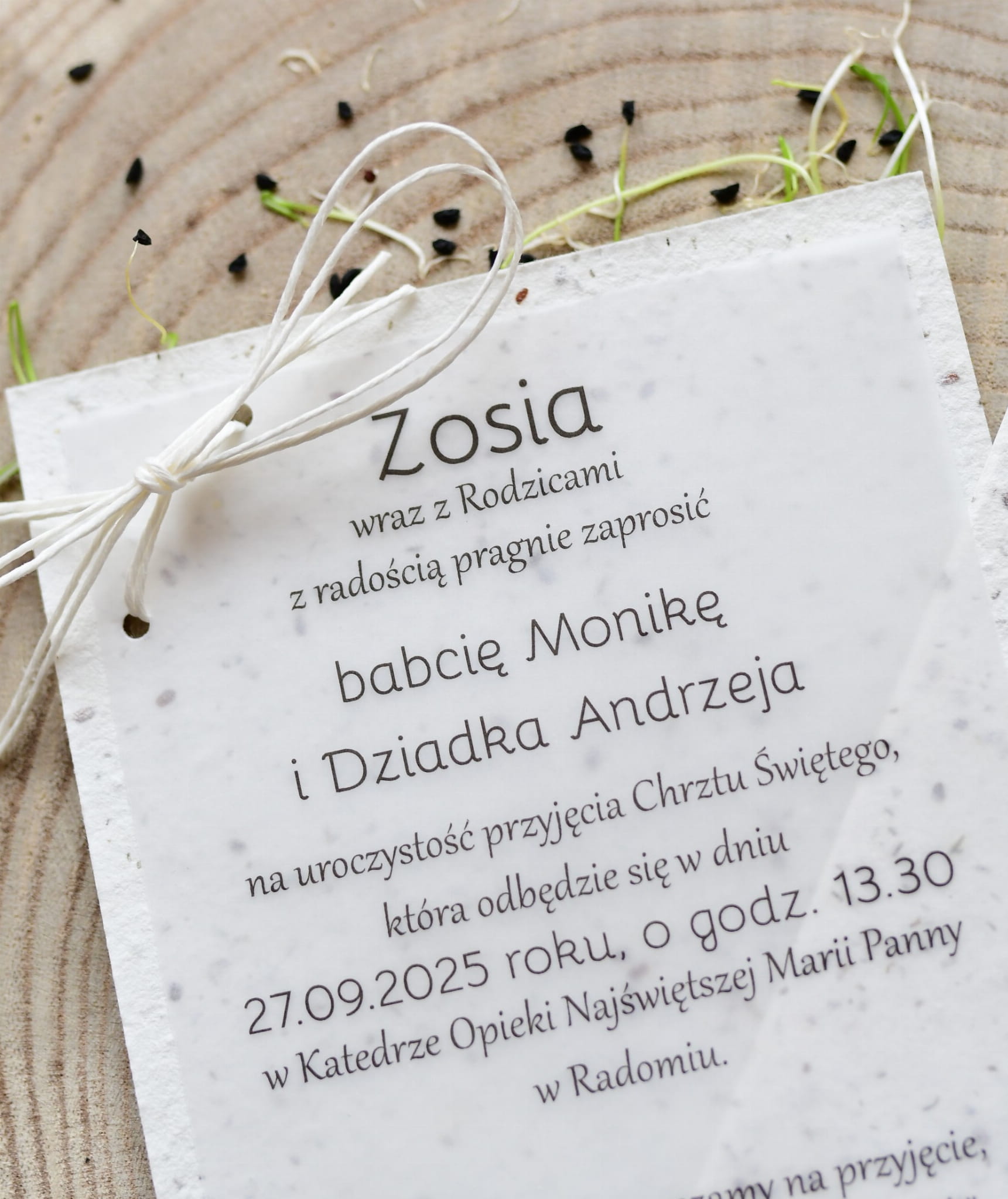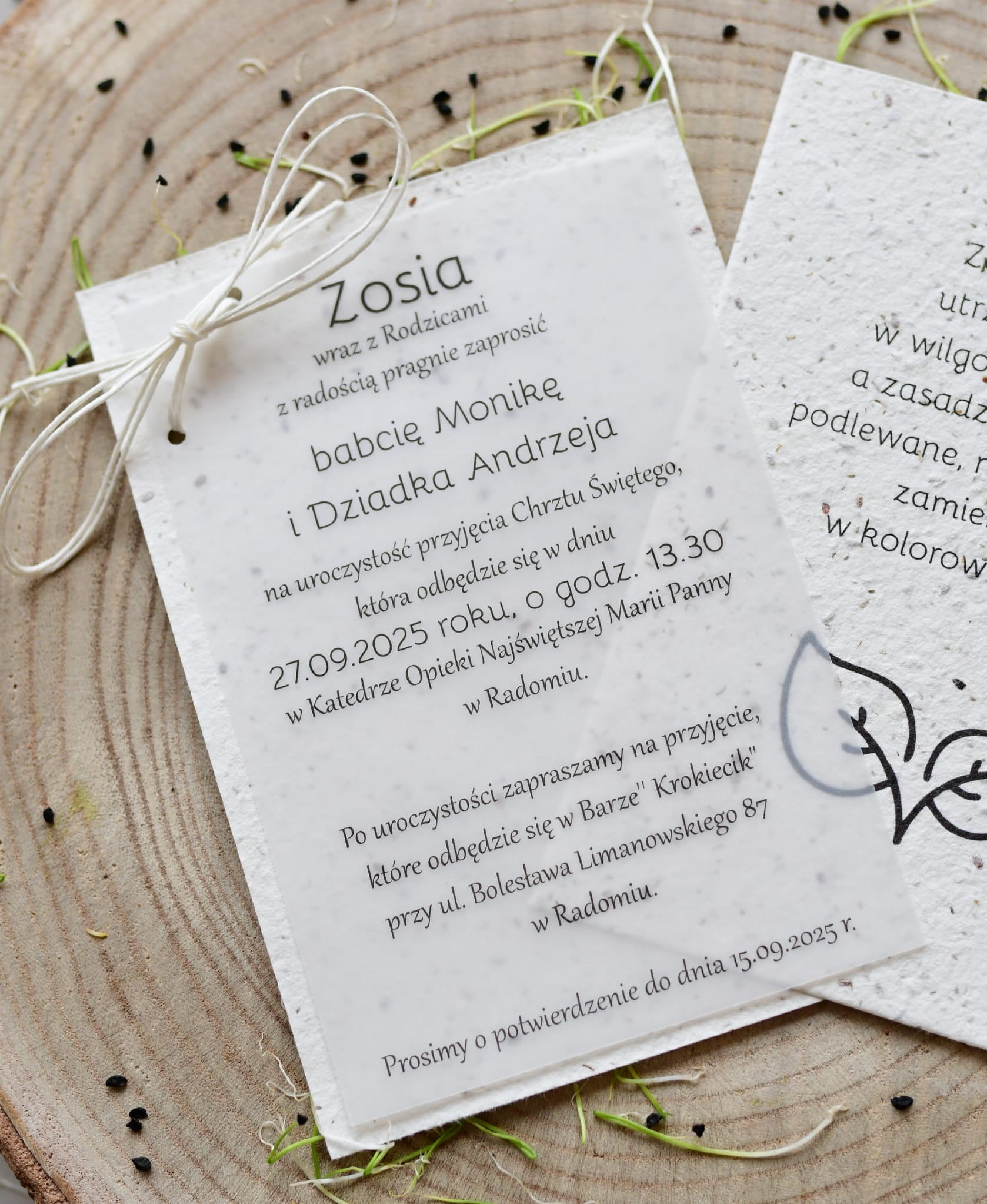 Zaproszenia na Chrzest Święty z rosnącego papieru z nasionkami roślin + ozdobna kalka.