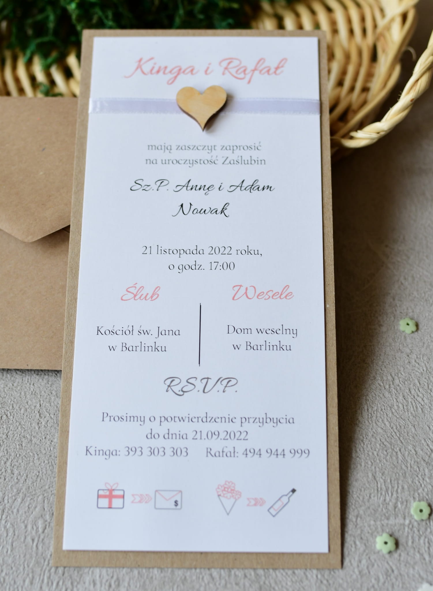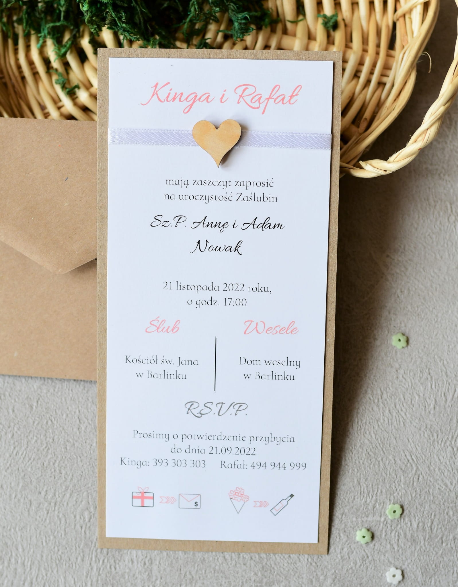 rustykalne zaproszenia weselne z drewnianym serduszkiem (minimalne zamówienie 15 szt.)