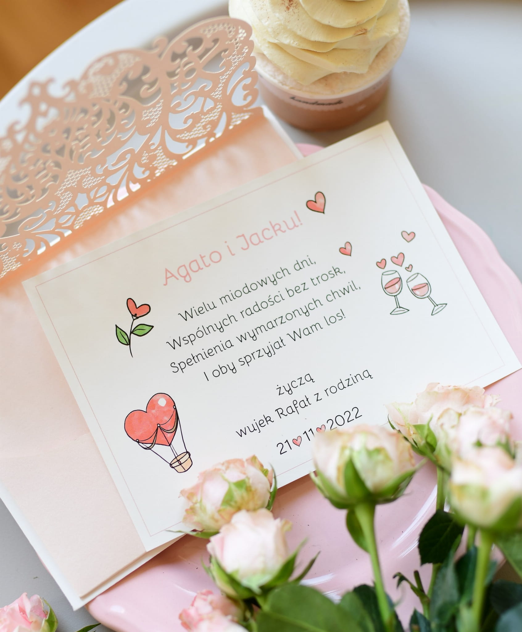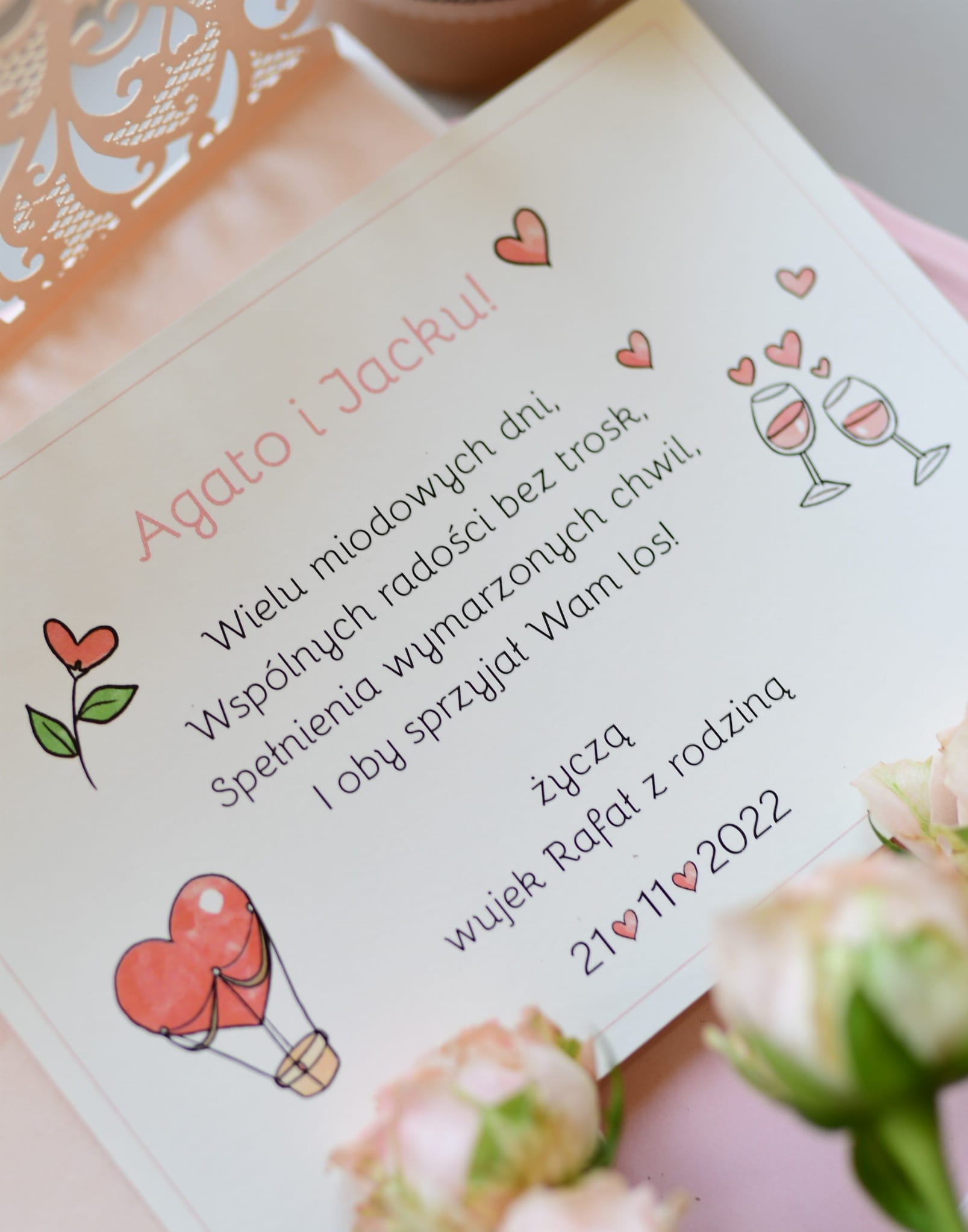 √ personalizacja w cenie (wydruk imion pary młodej, daty, od kogo są życzenia);