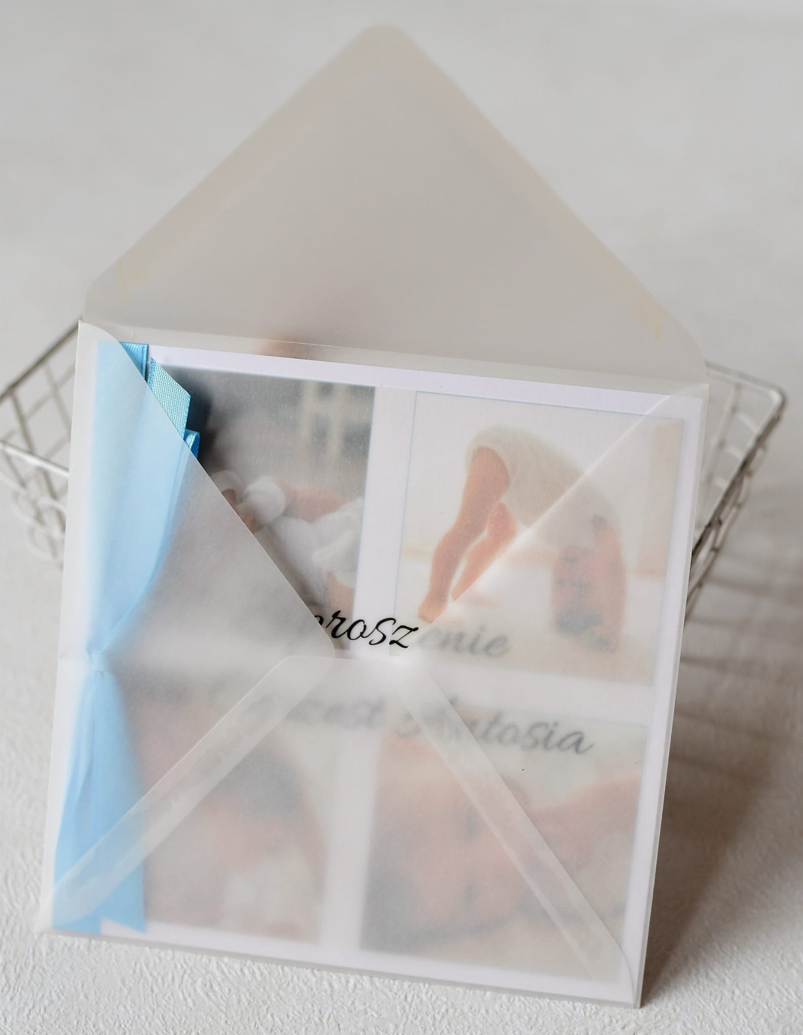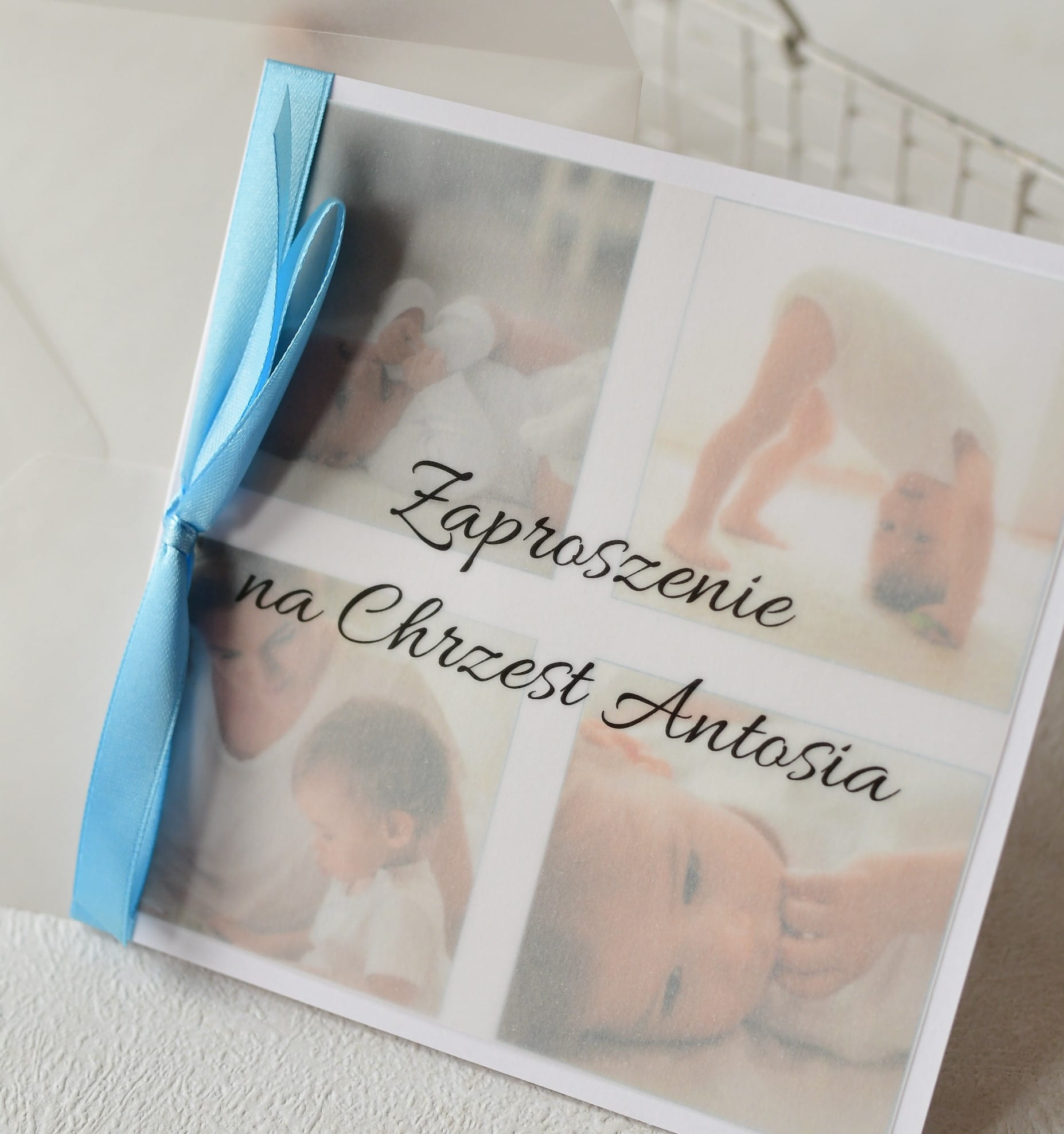 przepiękne, oryginalne zaproszenia na chrzest ze zdjęciem i ozdobą kalką (minimalne zamówienie 10 szt.)