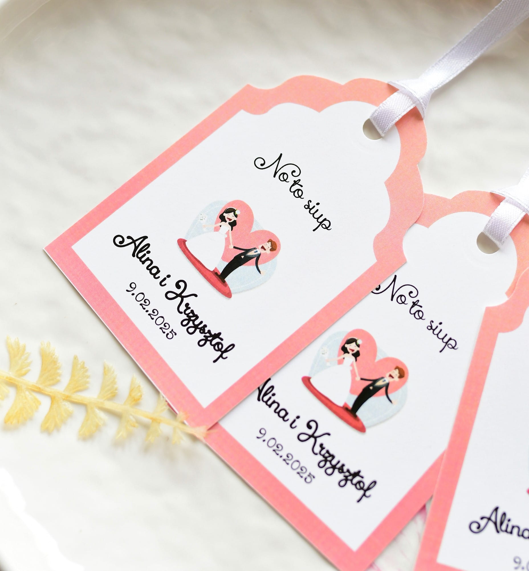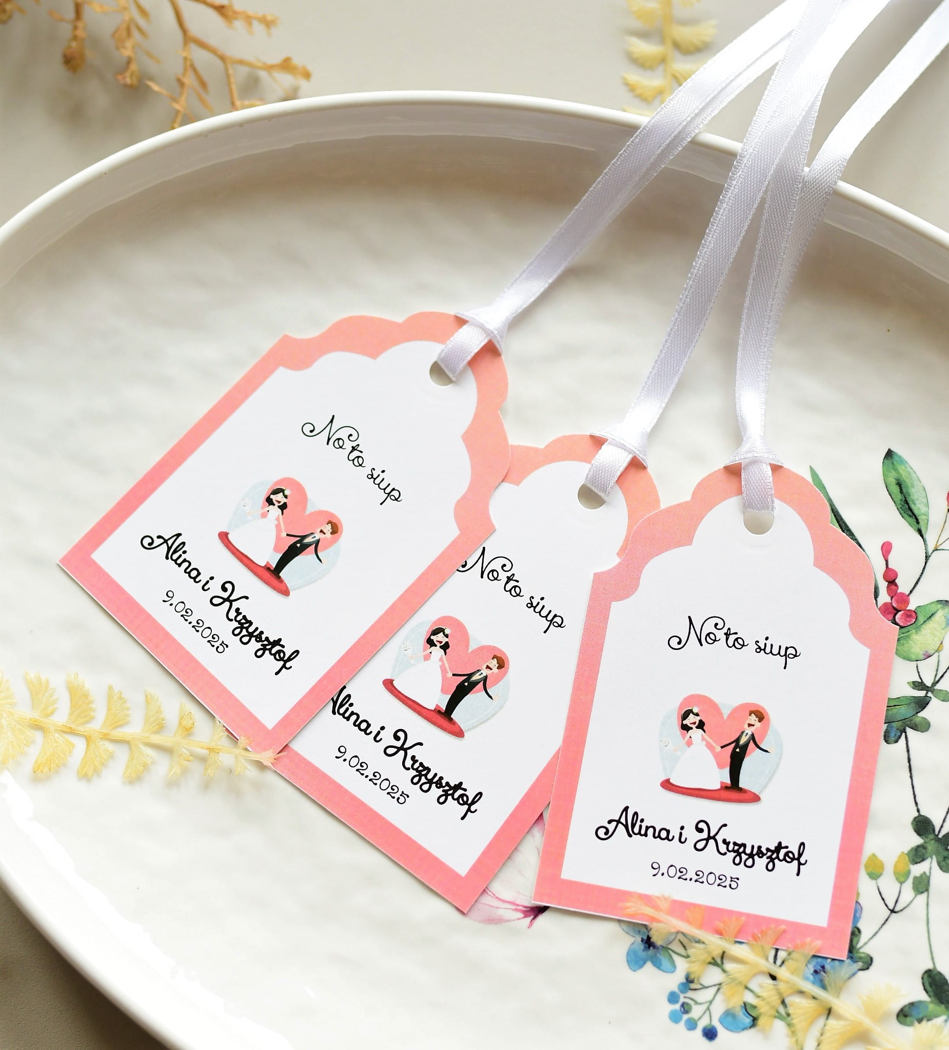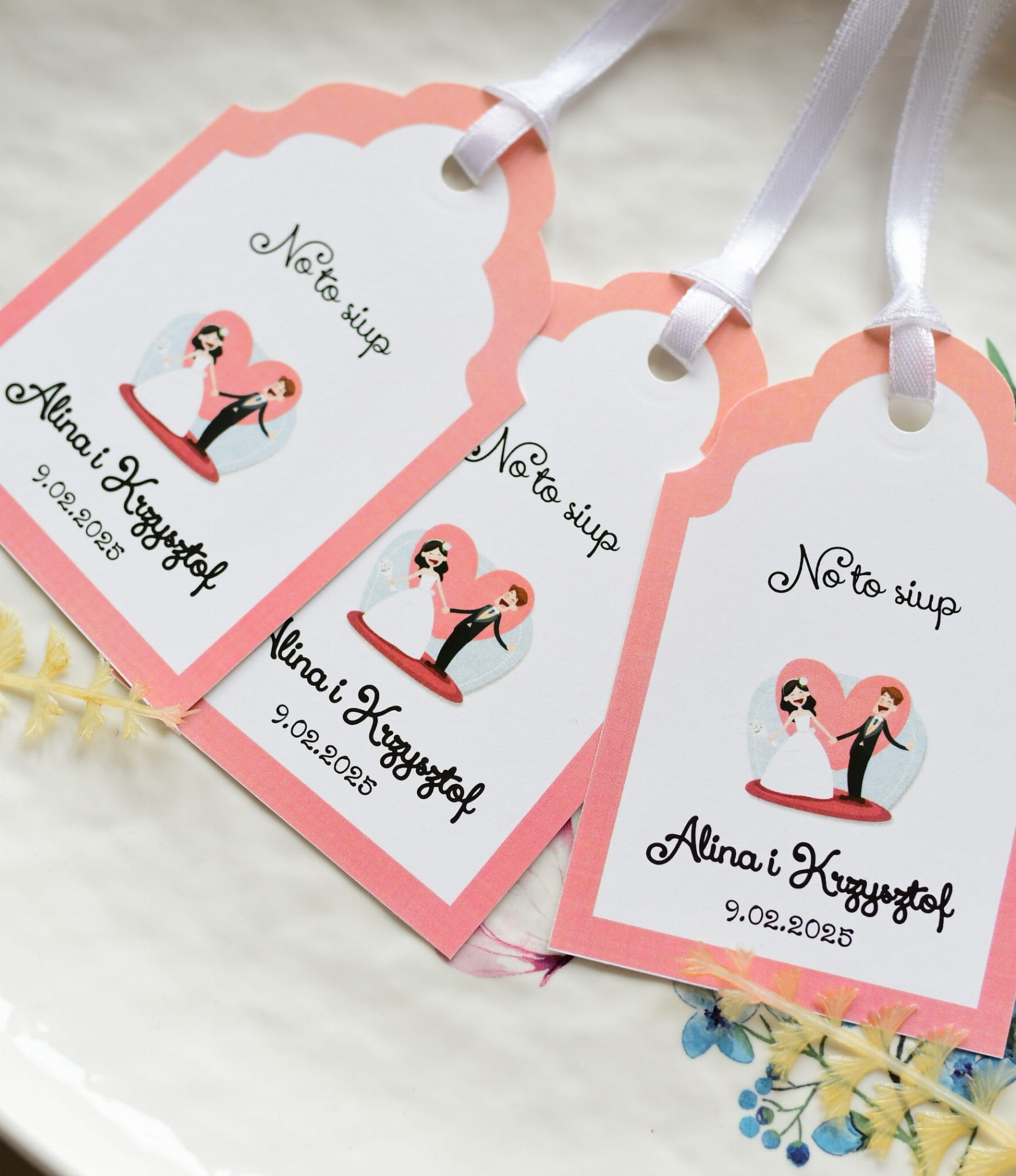 zawieszki na wódkę weselną z grafiką pary młodej (minimalne zamówienie 20 szt.)