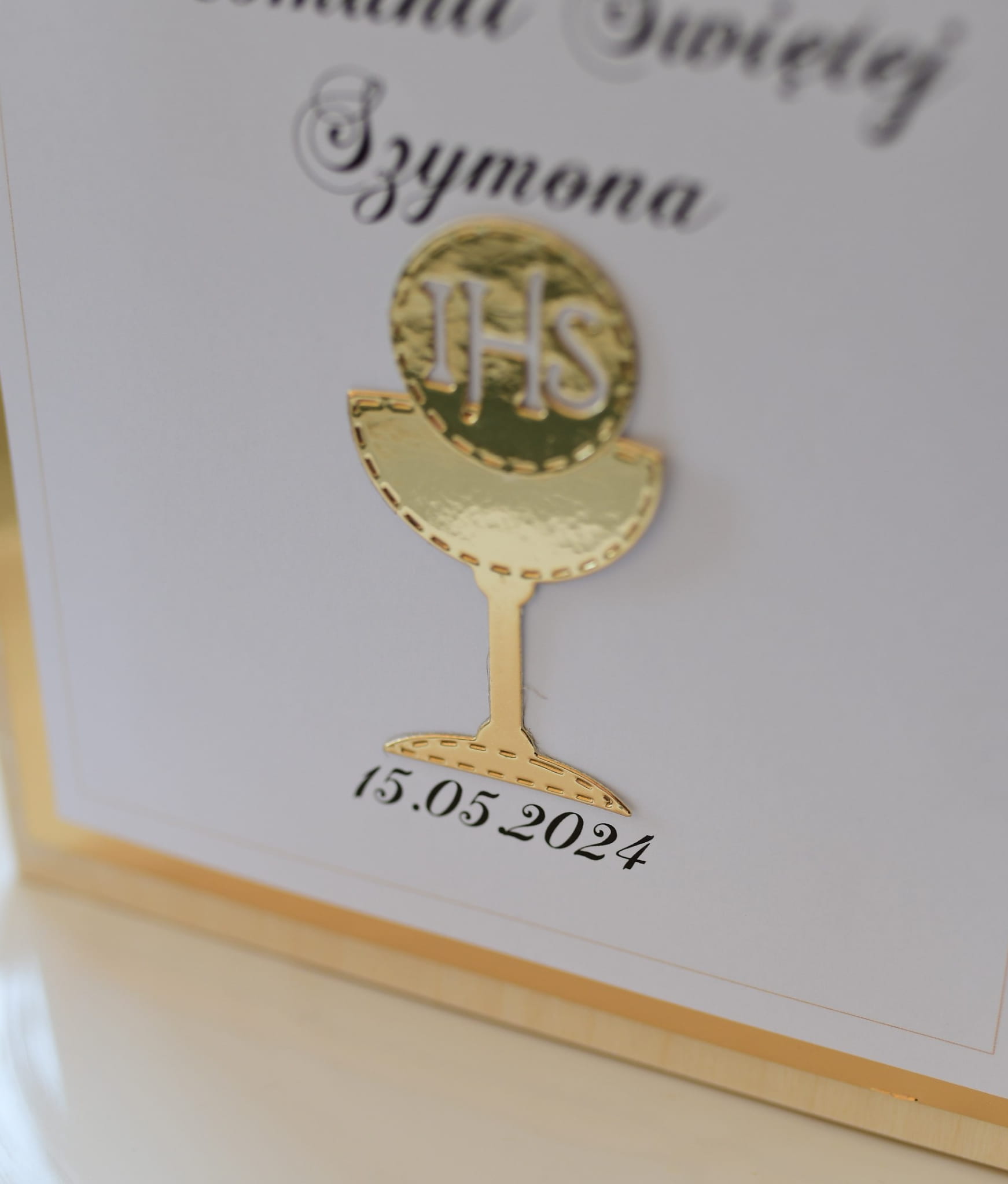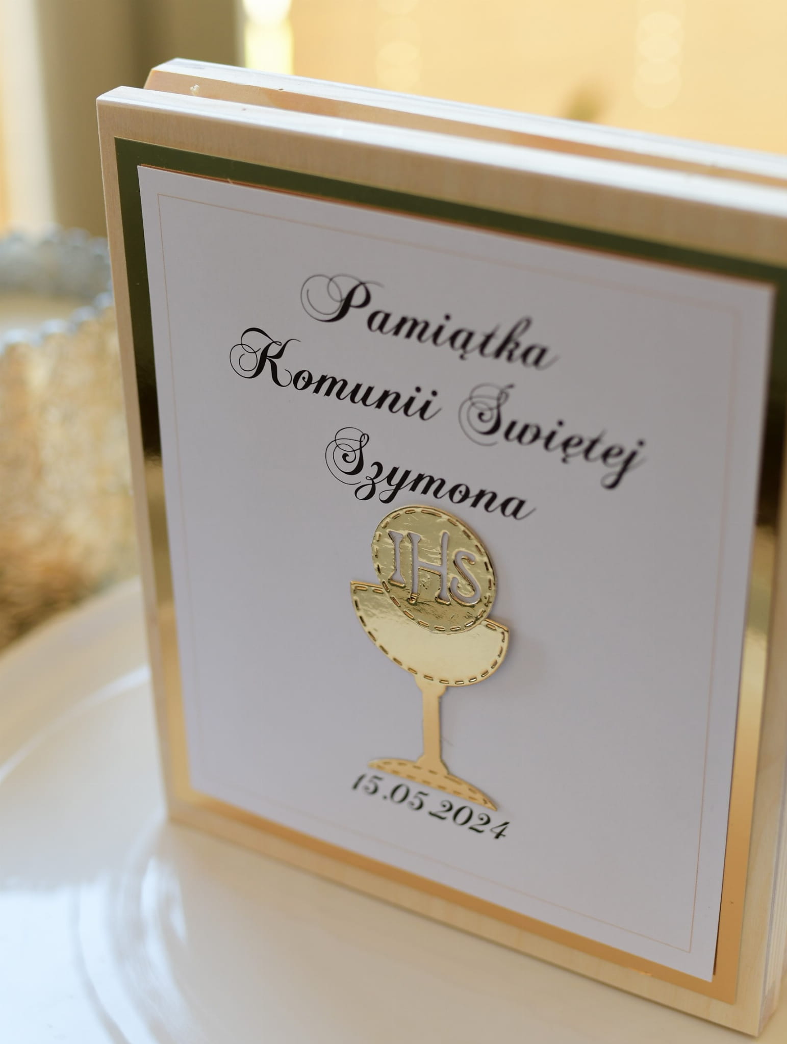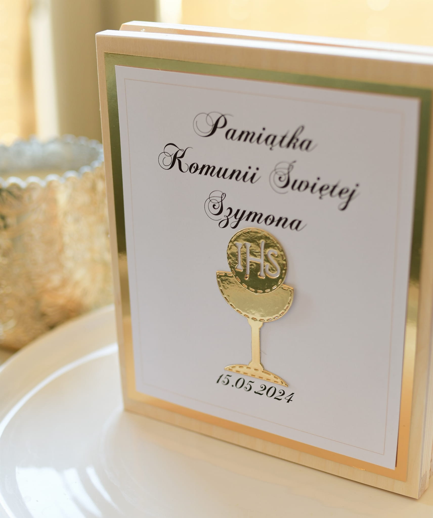 Personalizowana pamiątka komunijna z motywem złotego kielicha IHS.