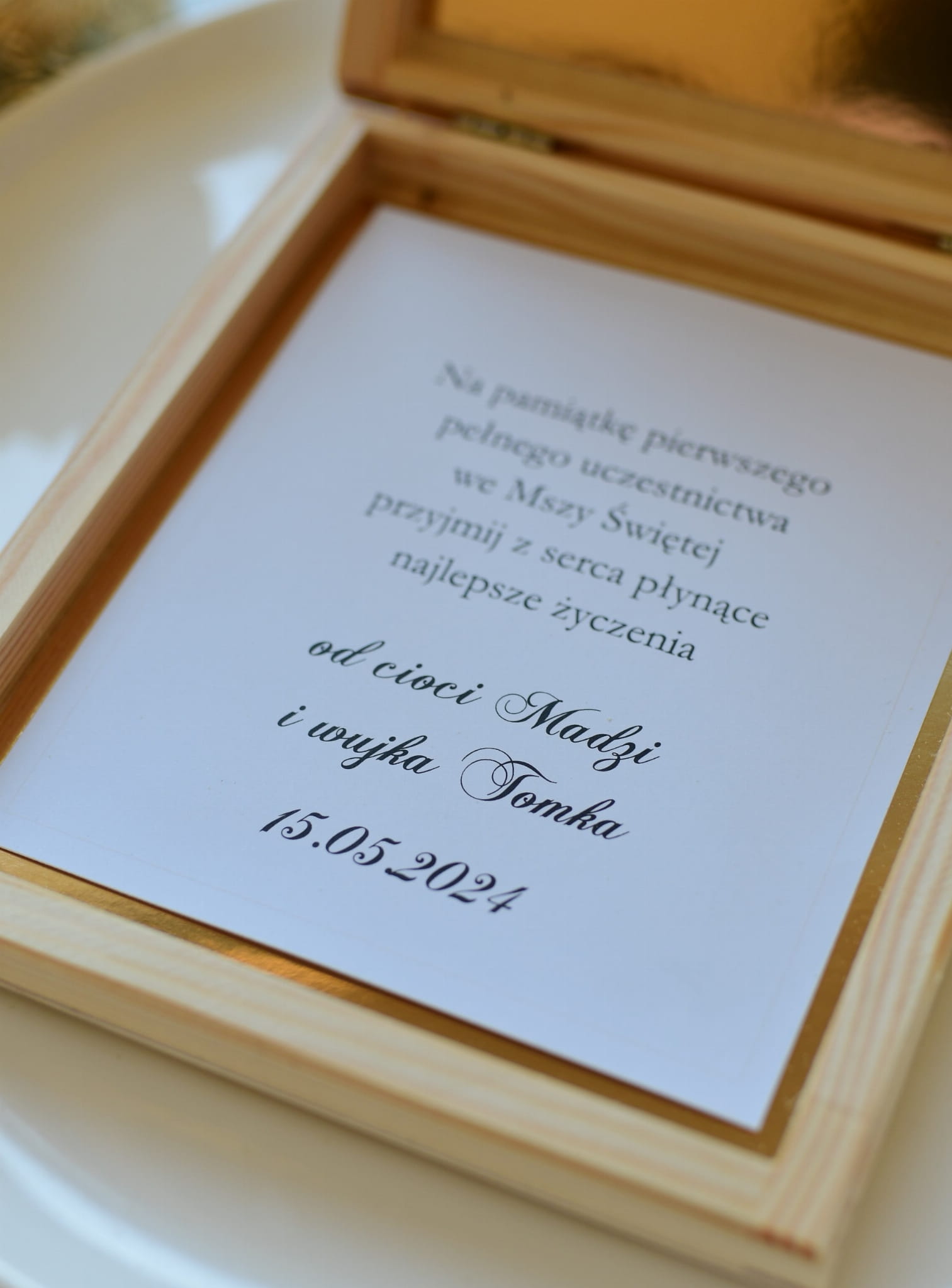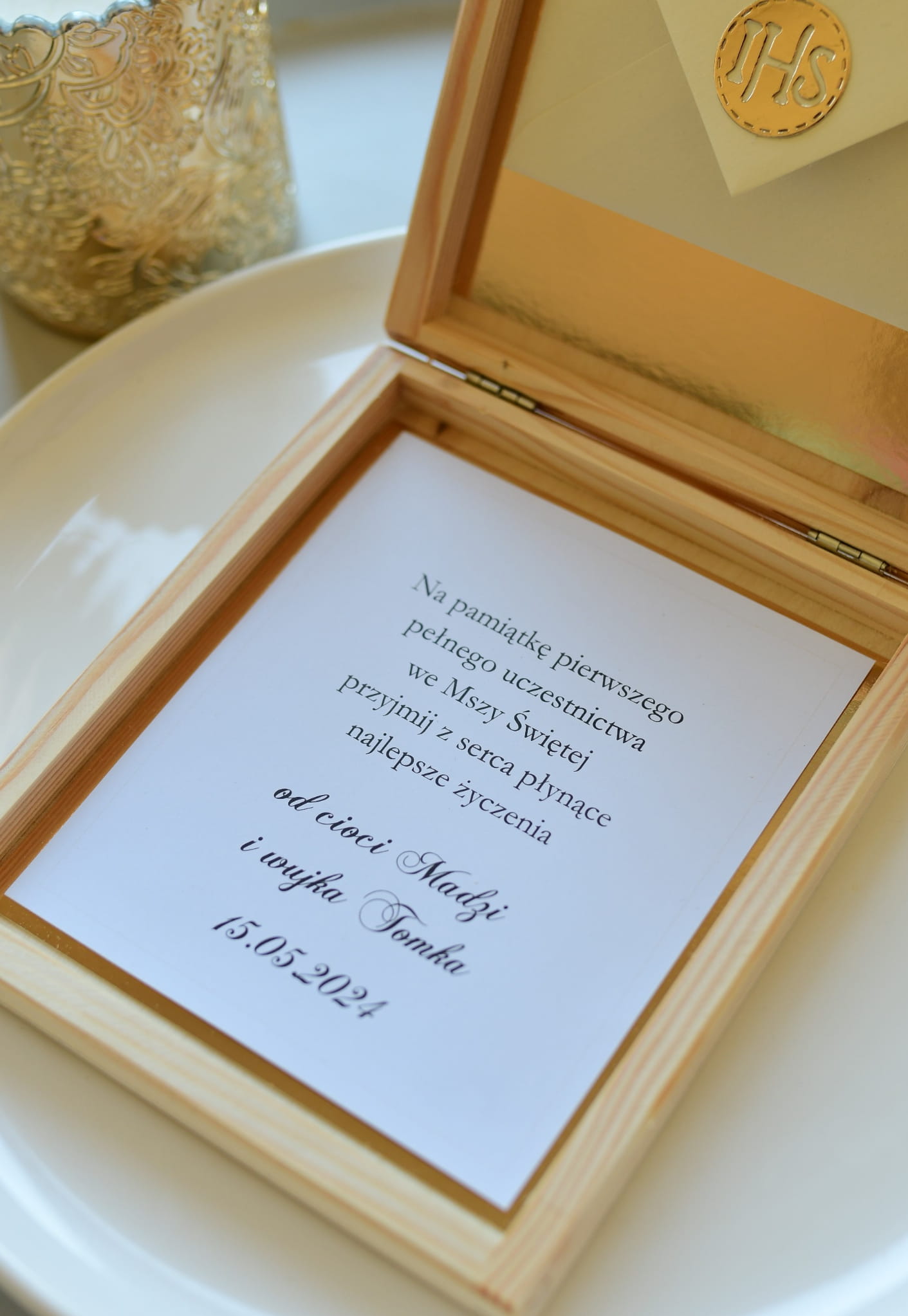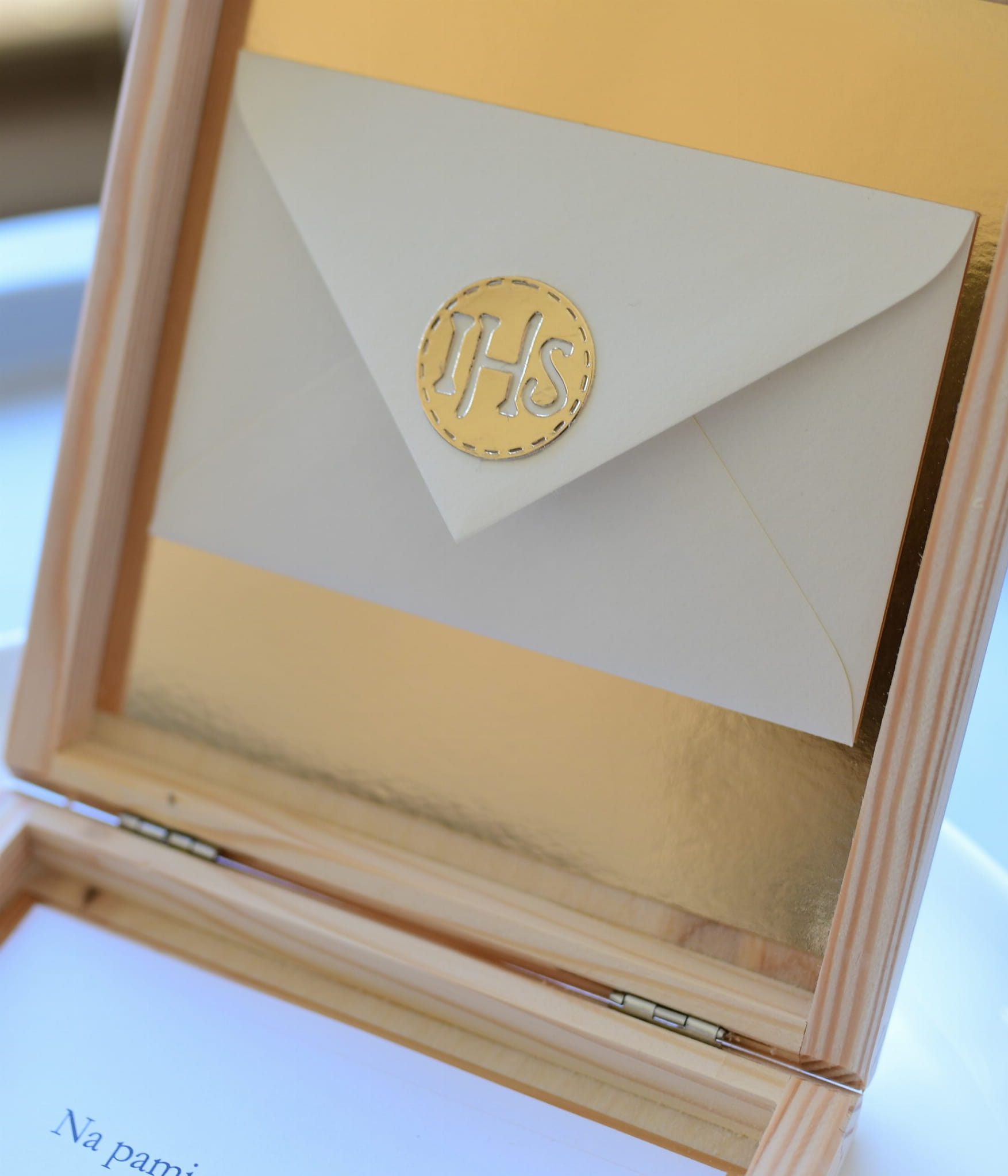 drewniana ZłOTA IHS skrzynka z życzeniami i kopertą z okazji I Komunii Świętej