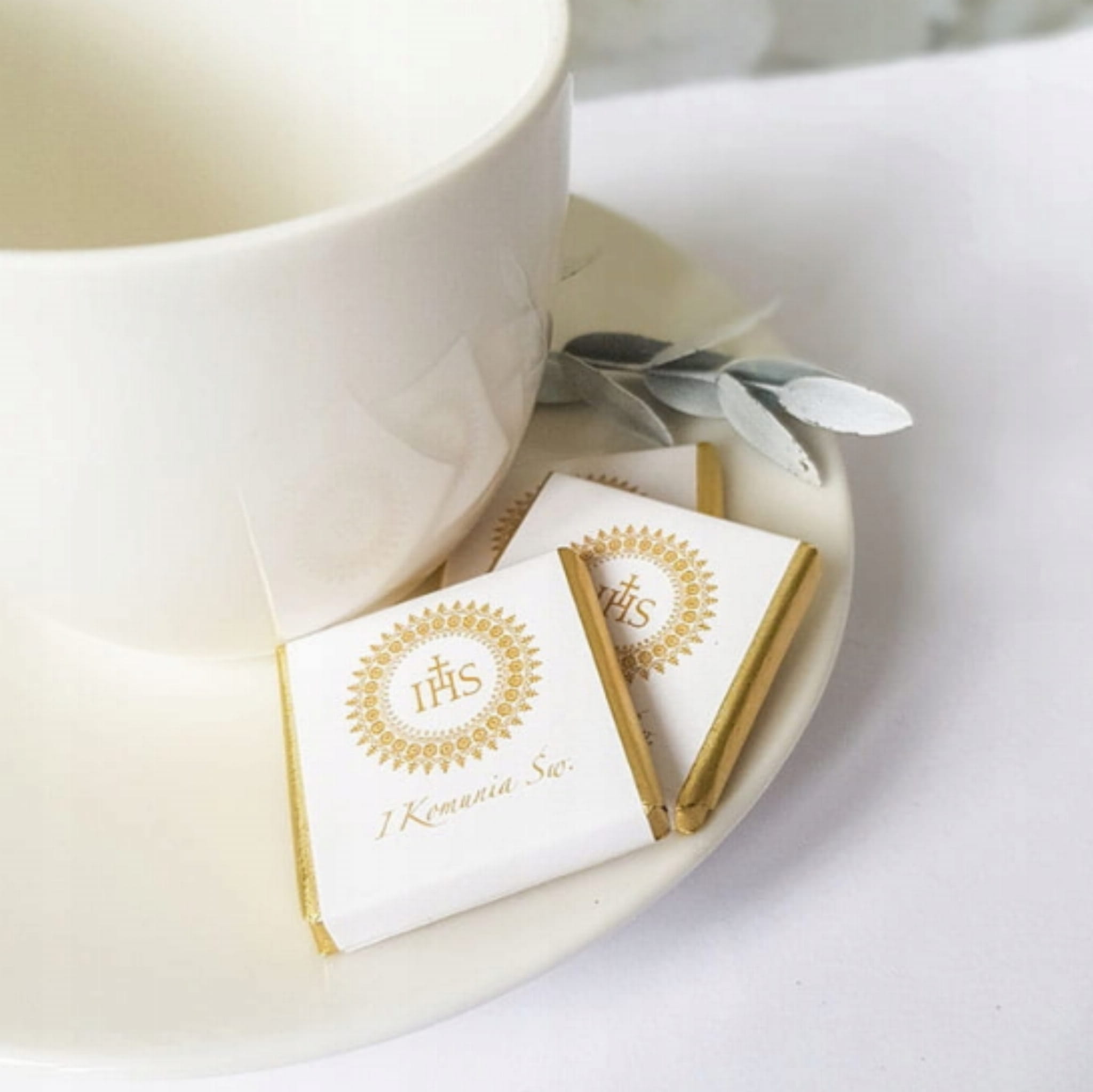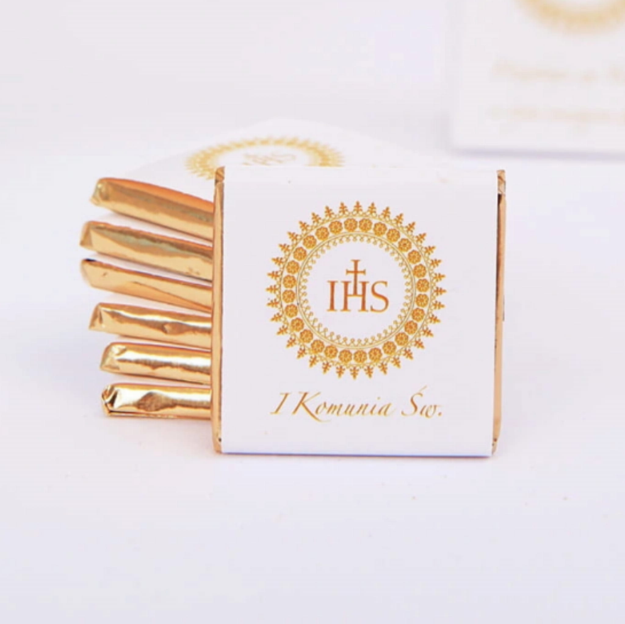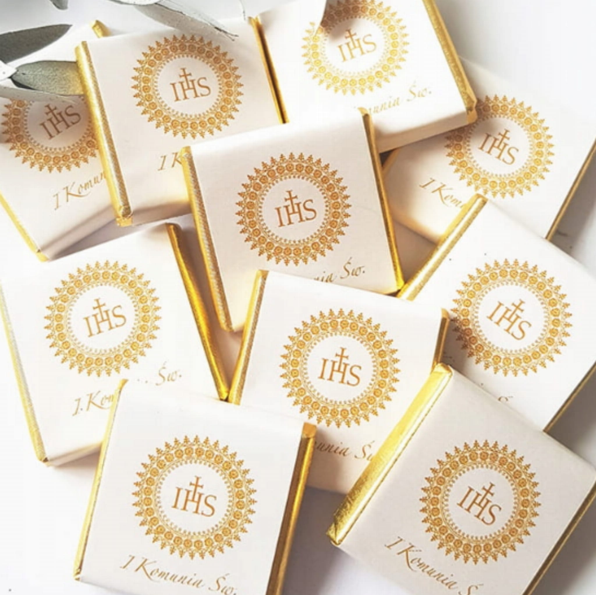 Słodkie podziękowania komunijne - złote czekoladki IHS.