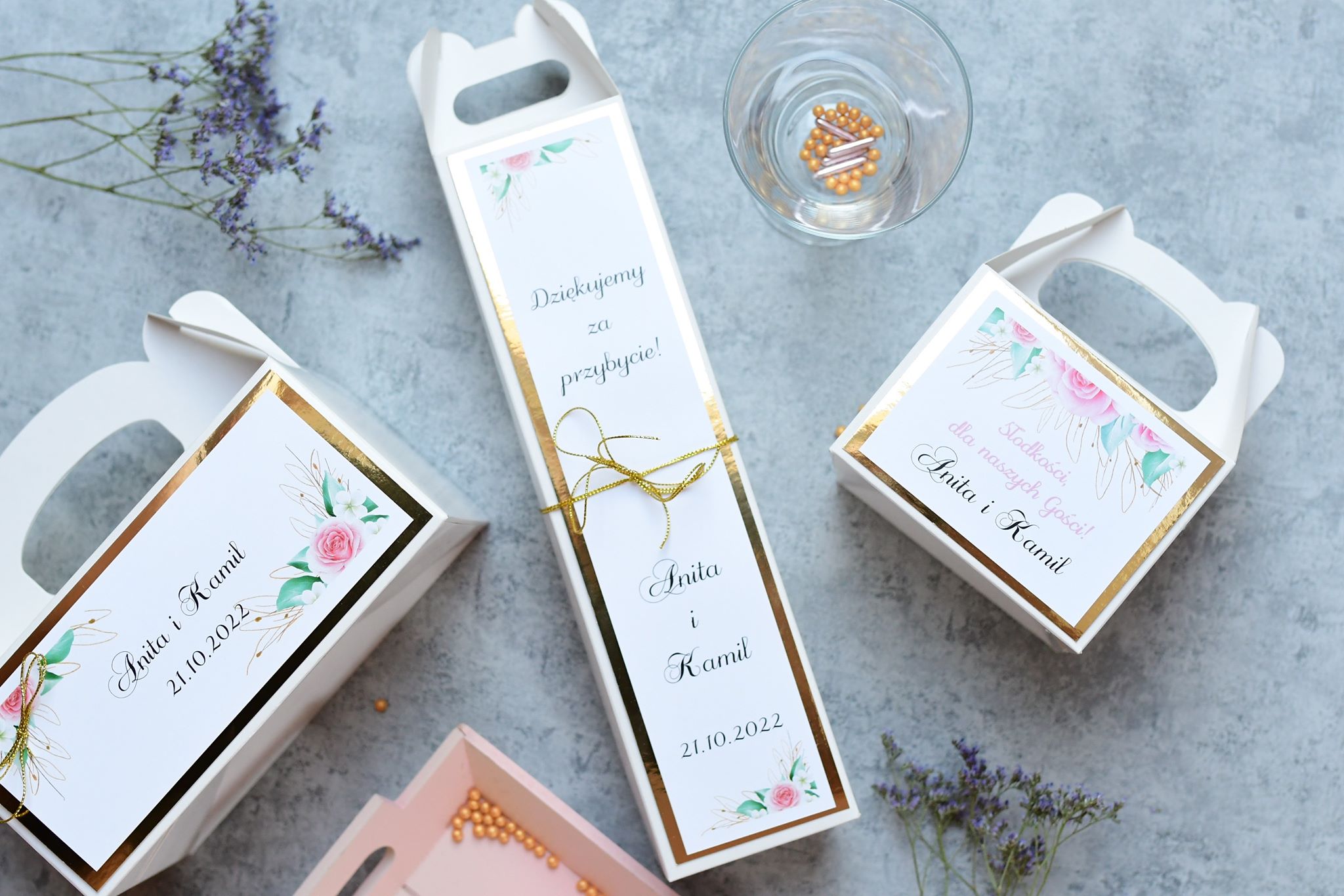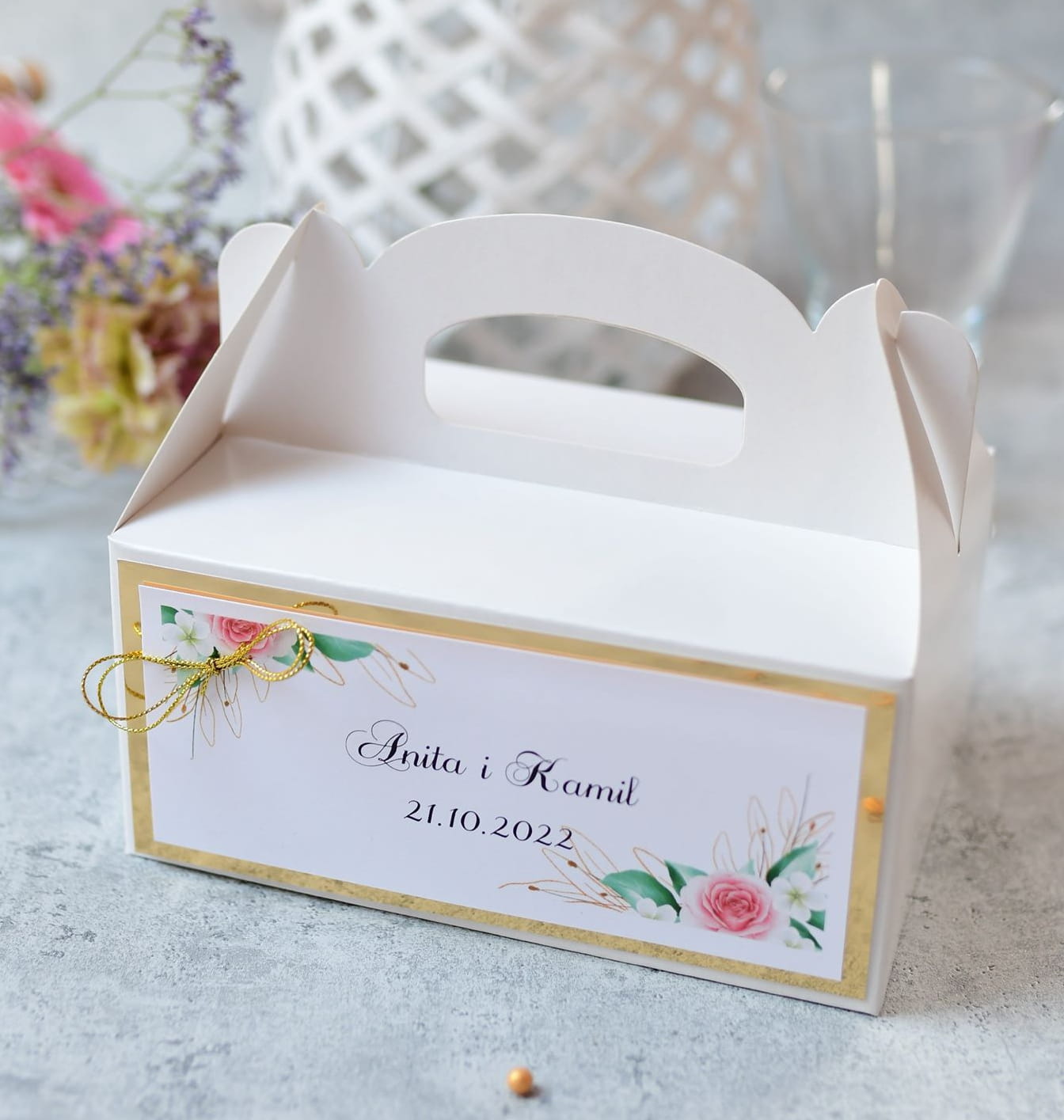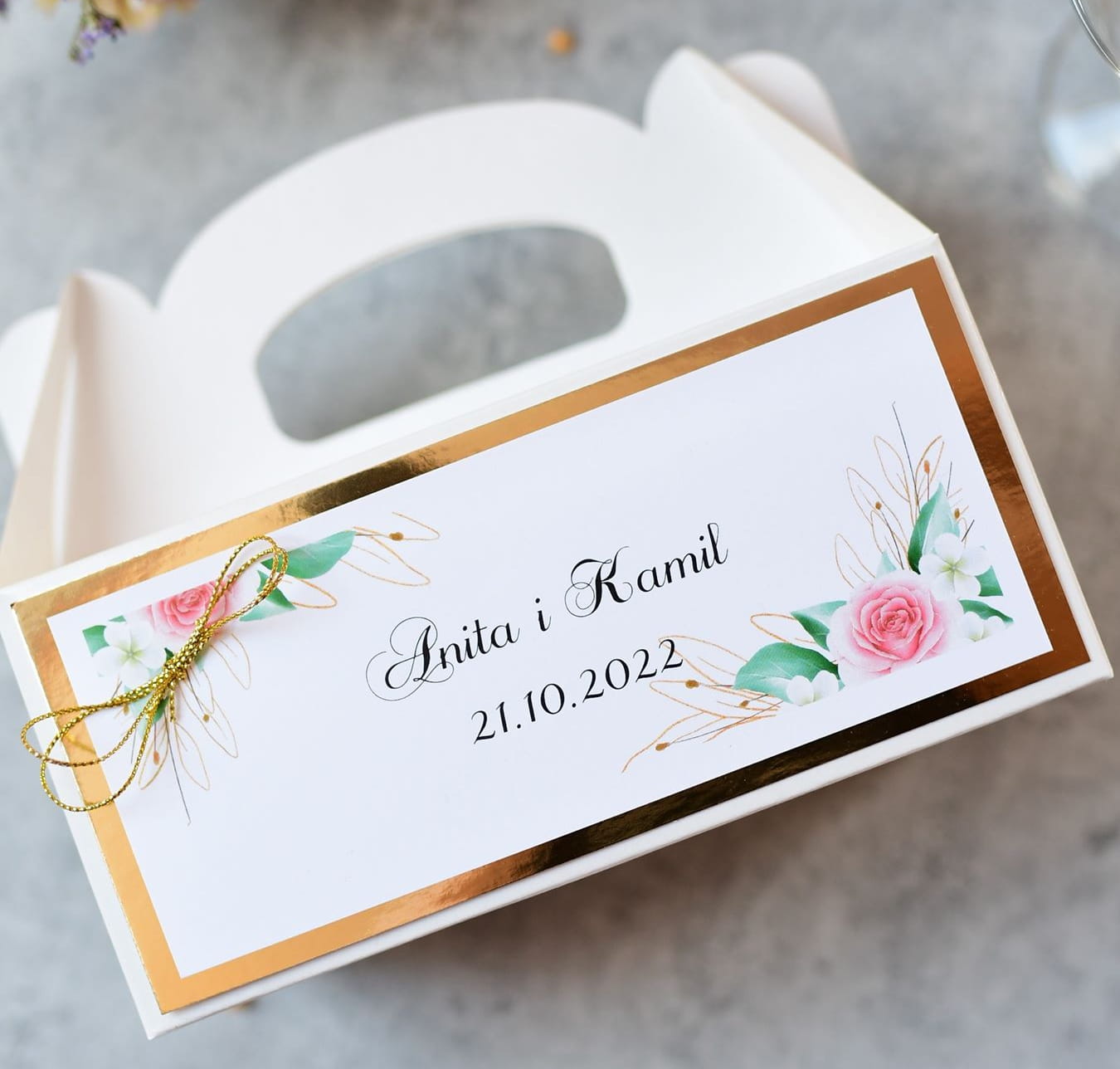 Jak zamówić złote pudełka z różami na ciasto weselne?