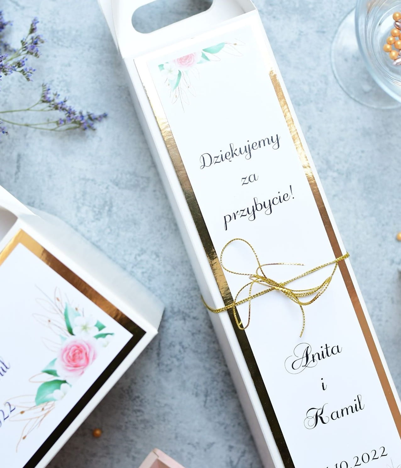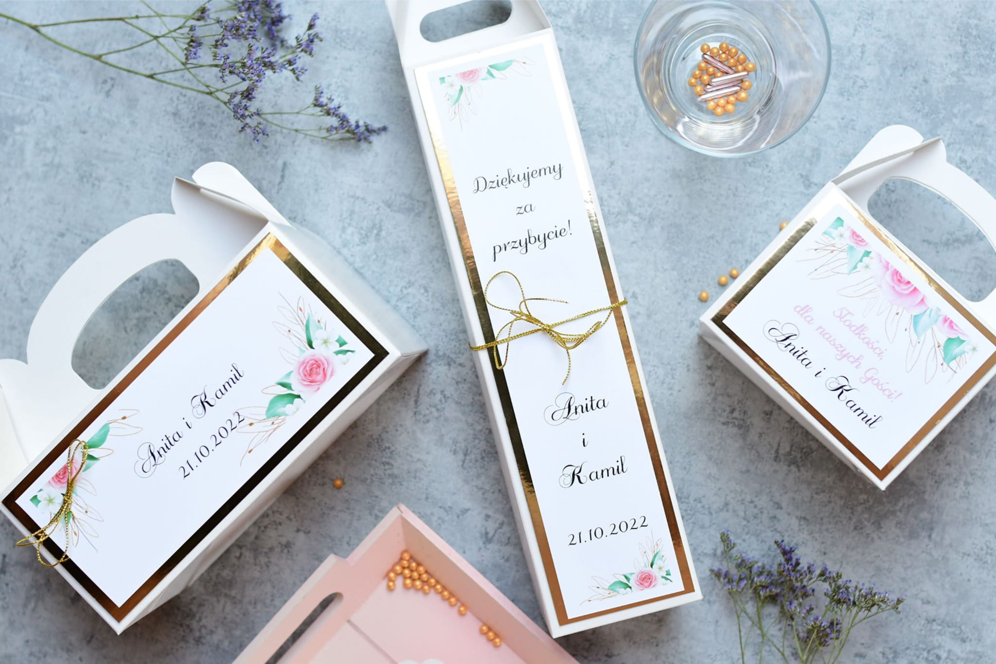 Personalizowane złoto-różowe pudełka na wódkę weselną